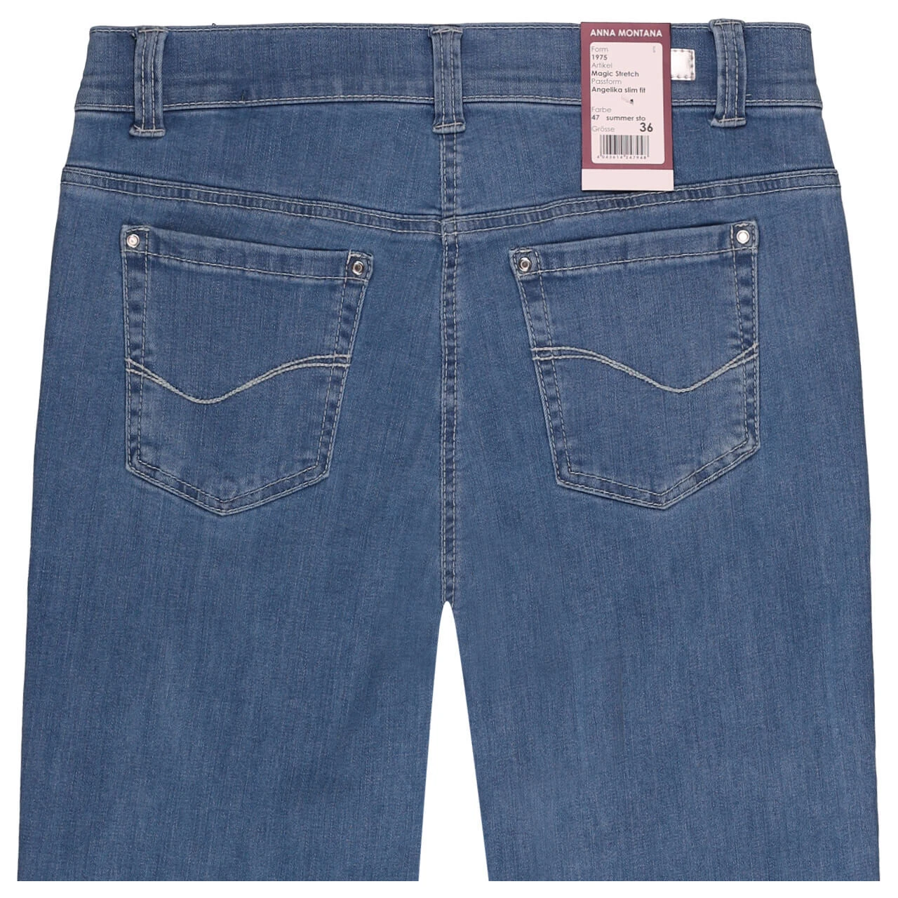 Silbergraue Nähte und ein silberner Patch zwischen den Gürtelschlaufen fügen sich gut in das Hellblau der Anna Montana Angelika ein. Der spezielle Denim bietet Ihnen ein ergonomisches Design und einen Push-Up-Effekt am Gesäß!