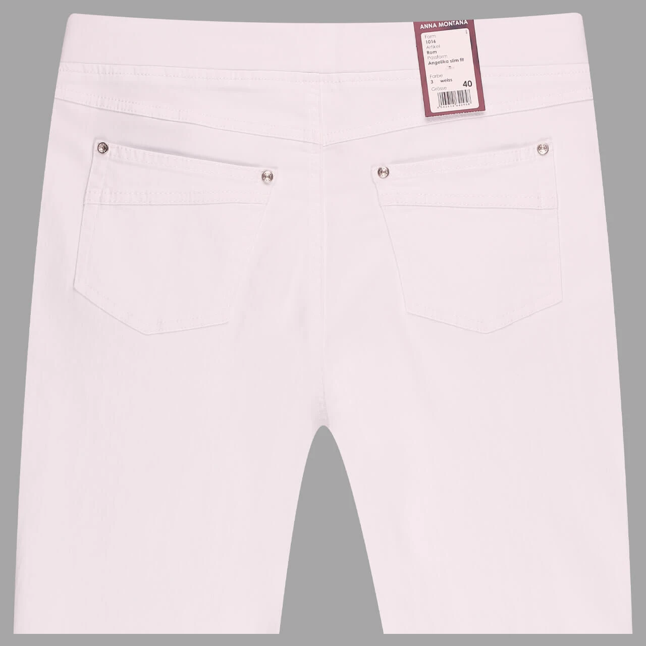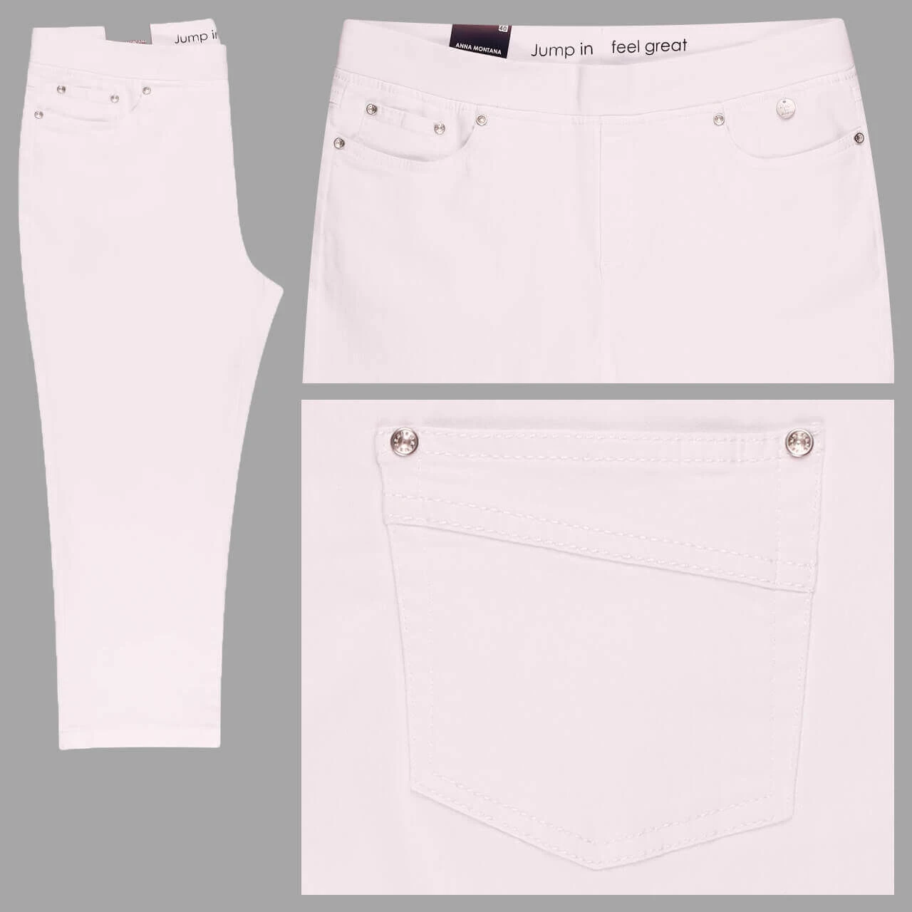 Reinhüpfen und fertig! Die Anna Montana Angelika überzeugt mit einem tollen Tragegefühl, denn statt auf einen Knopf setzt sie auf einen flexiblen Stretchbund. Schneeweiß und in luftiger 3/4-Länge eignet sich diese Damenjeans besonders für heißere Tage. Dank ihres 5-Pocket-Designs und ihrer angedeuteten Reißverschlussblende kann sie mit klassischem Jeanslook aber gut mithalten.
