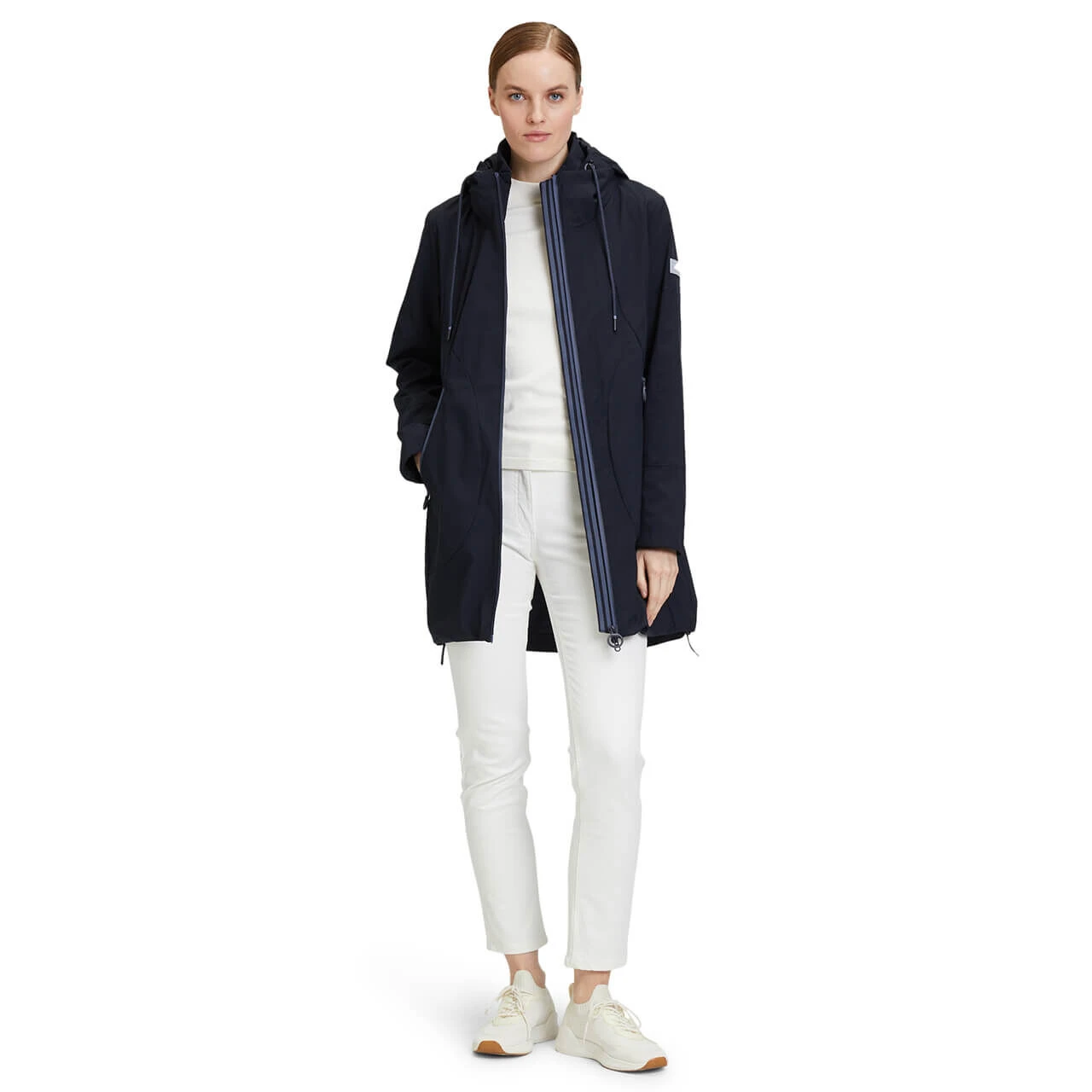 Die Übergangszeit kann noch so regnerisch und stürmisch sein, die Damenjacke von Betty Barclay steht Ihnen bei. Das wetterfeste Obermaterial und die Gummilippen an den Reißverschlüssen verhindern ungewollte Nässe. Die Kapuze ist in den Stehkragen der Jacke integriert: Sowohl vor als auch hinter der Kopfbedeckung haben Sie also einen Kragen, der Sie warmhält. Ziernähte auf dem eleganten Dunkelblau betonen den leicht taillierten Schnitt der Übergangsjacke. Eine Überraschung wartet auf der Rückseite: Dort hat sich eine vierte Tasche mit Zipper angesiedelt.