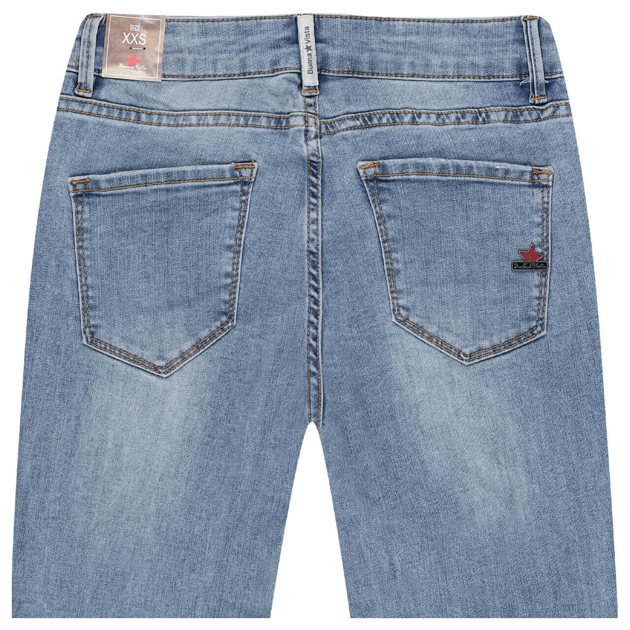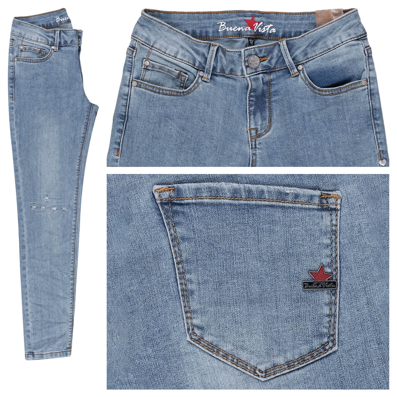 Heller Denim liegt voll im Trend! Die leichte Waschung sowie die Destroyed-Effekte im Kniebereich machen die Buena Vista Italy besonders lässig. Senfgelbe Nähte kontrastieren die Damenjeans.