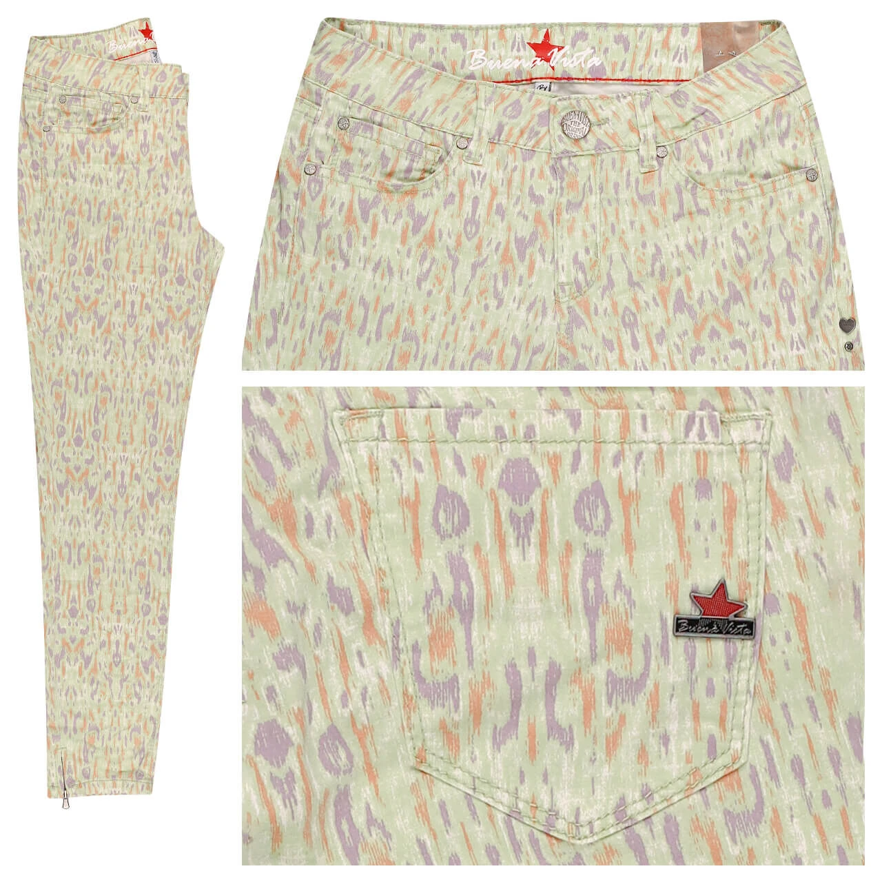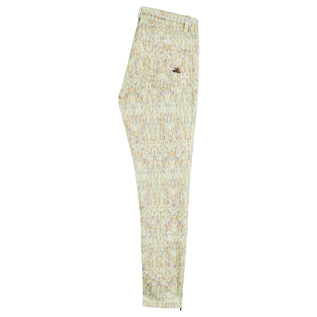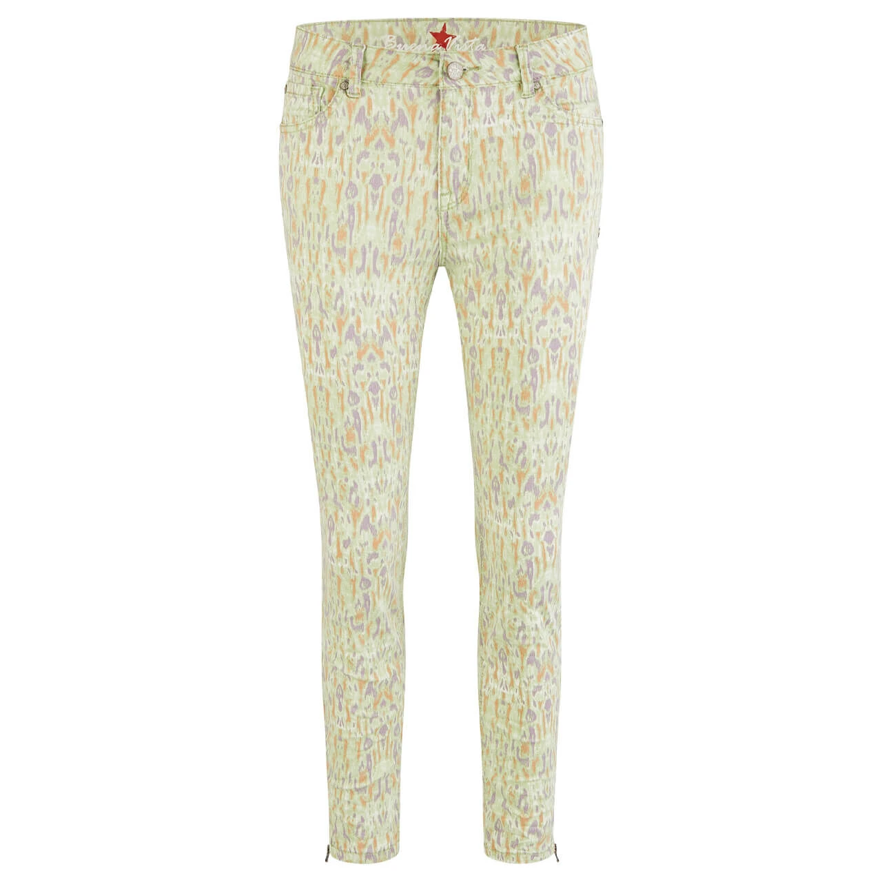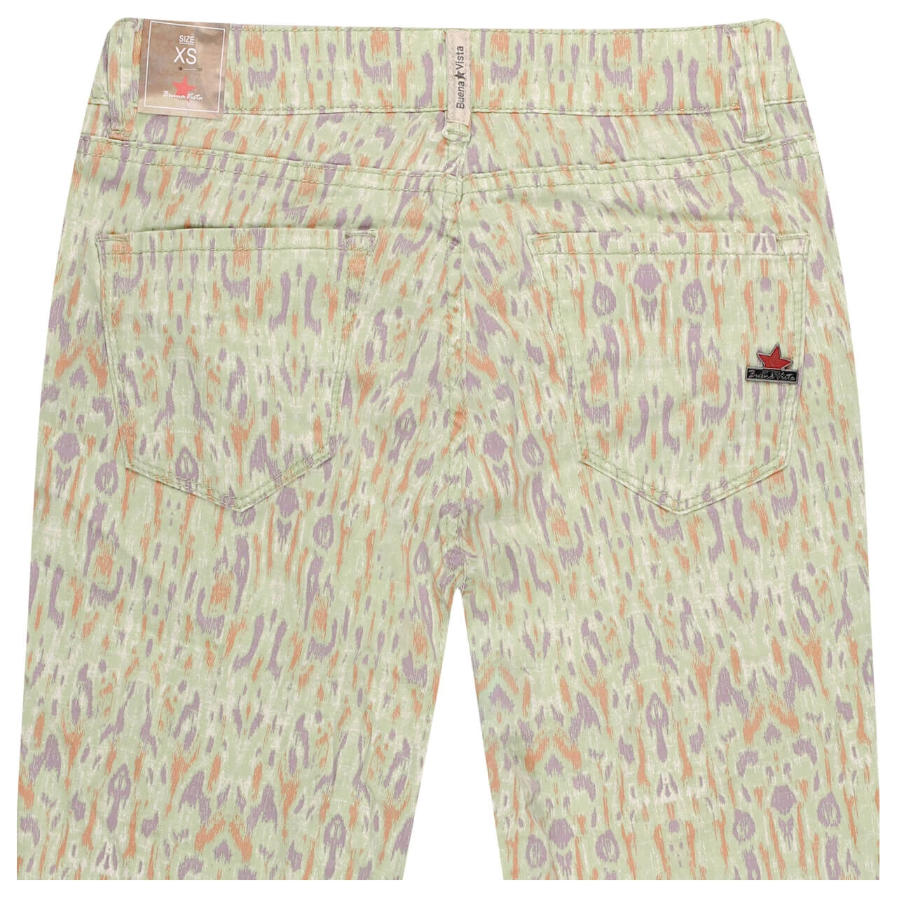 Feiern Sie fröhlich-frische Farben! Die Buena Vista Italy V kommt in einem hellen Grün daher, das von kleinen Sprenkeln in Lila und Orange kunstvoll erweitert wird. Fertig ist der abstrakte Allover-Print, der diese Damenhose zu einem individuellen Kleidungsstück macht.