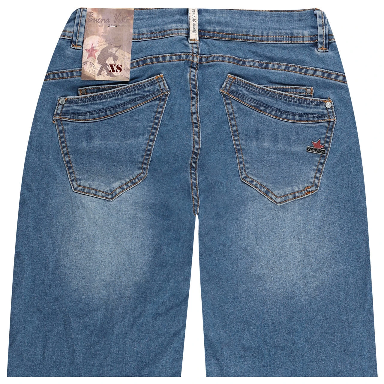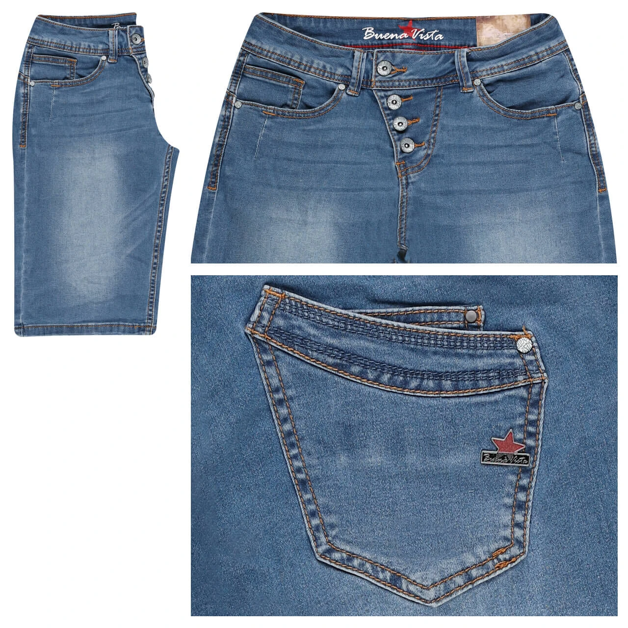 Ein besonders weicher Denim, ansonsten aber klassisch: Die Buena Vista Malibu-Short zeigt einen mittelblauen Denim mit braunen Nähten und spricht sich damit für einen zeitlosen Look aus. Gebrandete Knöpfe und Nieten sowie der Metallstern auf der Gesäßtasche repräsentieren die Marke.