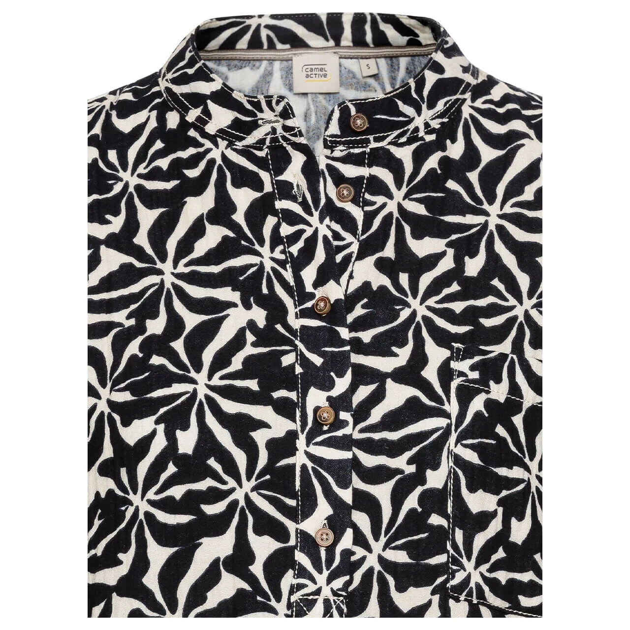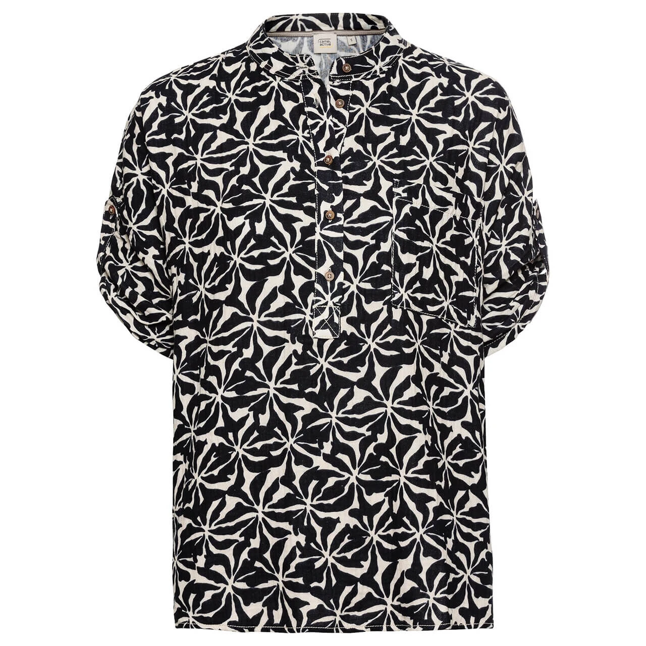 Mit dieser Camel active Damen Bluse haben Sie ein neues Lieblingsteil in Ihrer Garderobe! Der Alloverprint in Blau und Weiß kann in der passenden Kombination sowohl elegant, als auch perfekt im Alltag getragen werden. Highlights bilden der geschmackvolle Ausschnitt und die krempelbaren Ärmel.