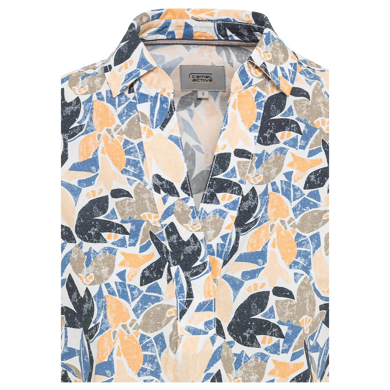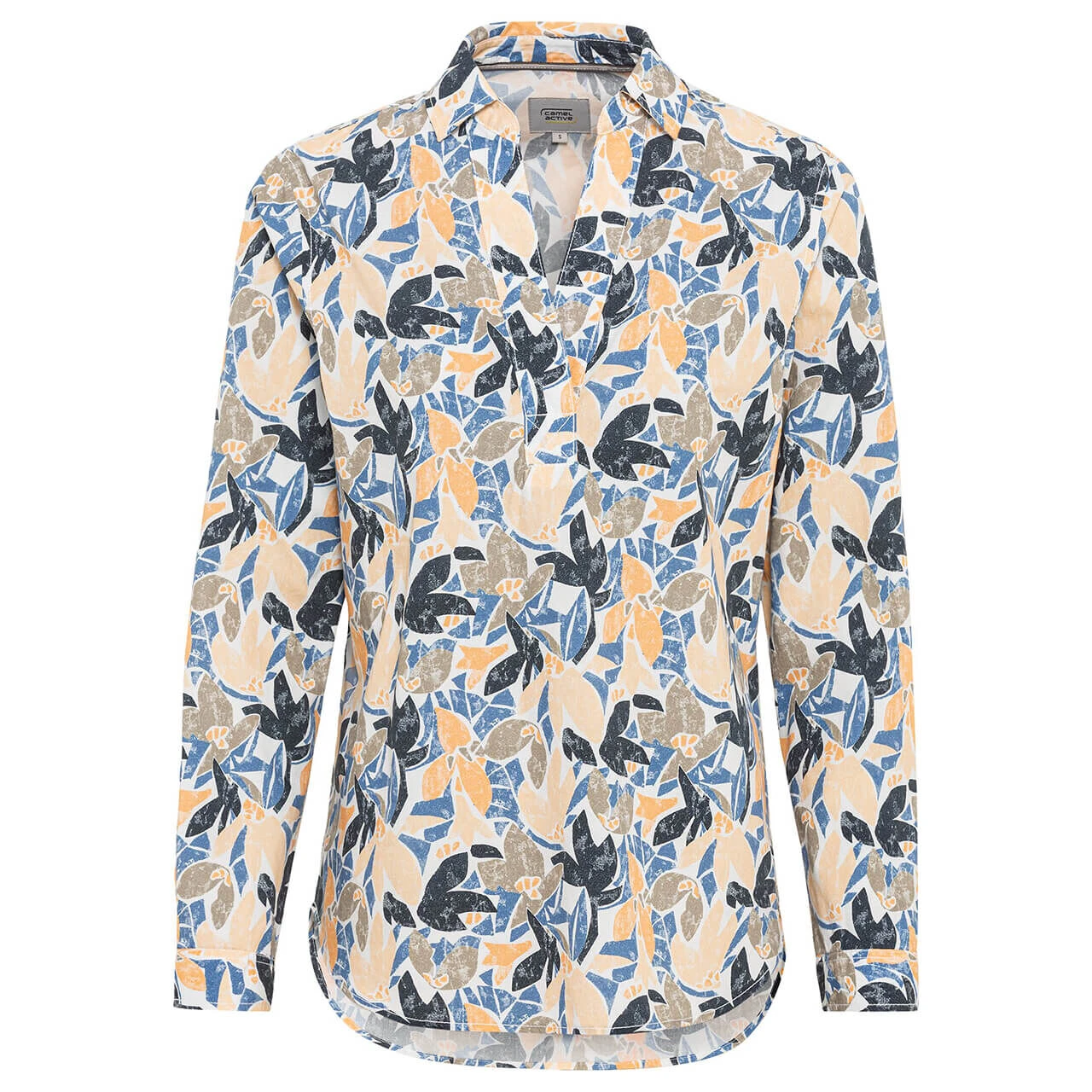 Diese Camel active Damen Bluse mit malerisch-abstraktem Blumenmuster eignet sich für alle kleinen und feinen Anlässe. Das Besondere an dem Oberteil: Es kombiniert den Tunika-Ausschnitt mit einem klassischen Kentkragen.