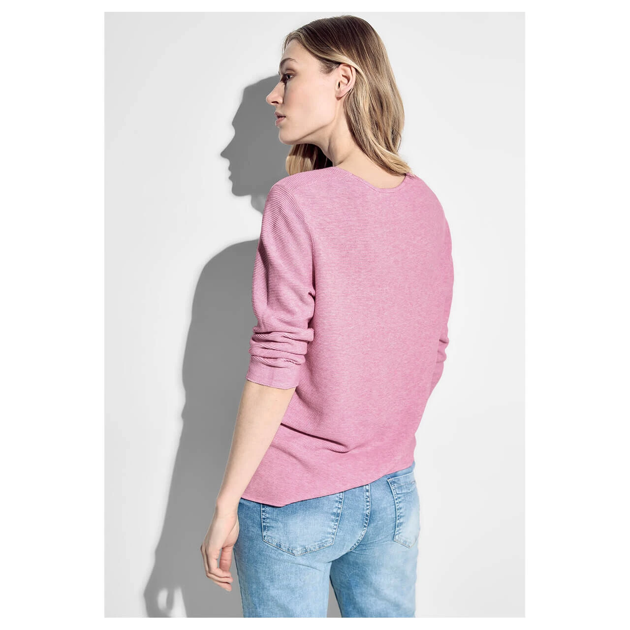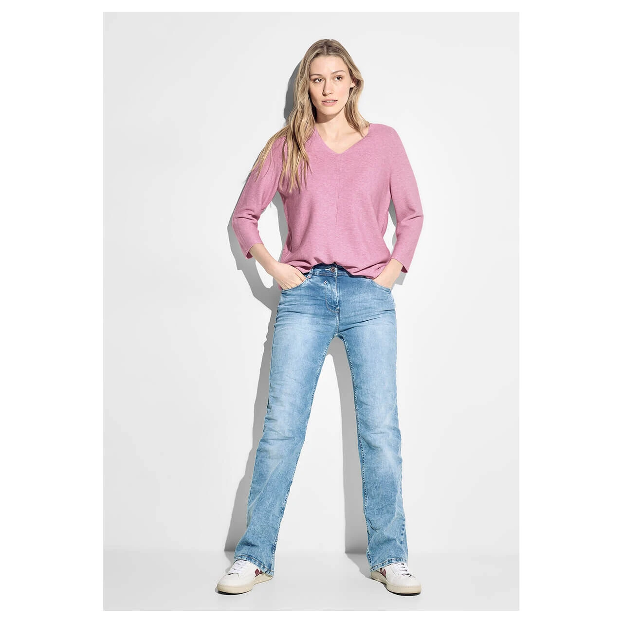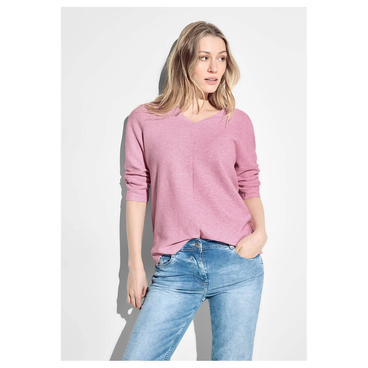 Damen 3/4 Arm Pullover Structured V-Neck in Rosa meliert