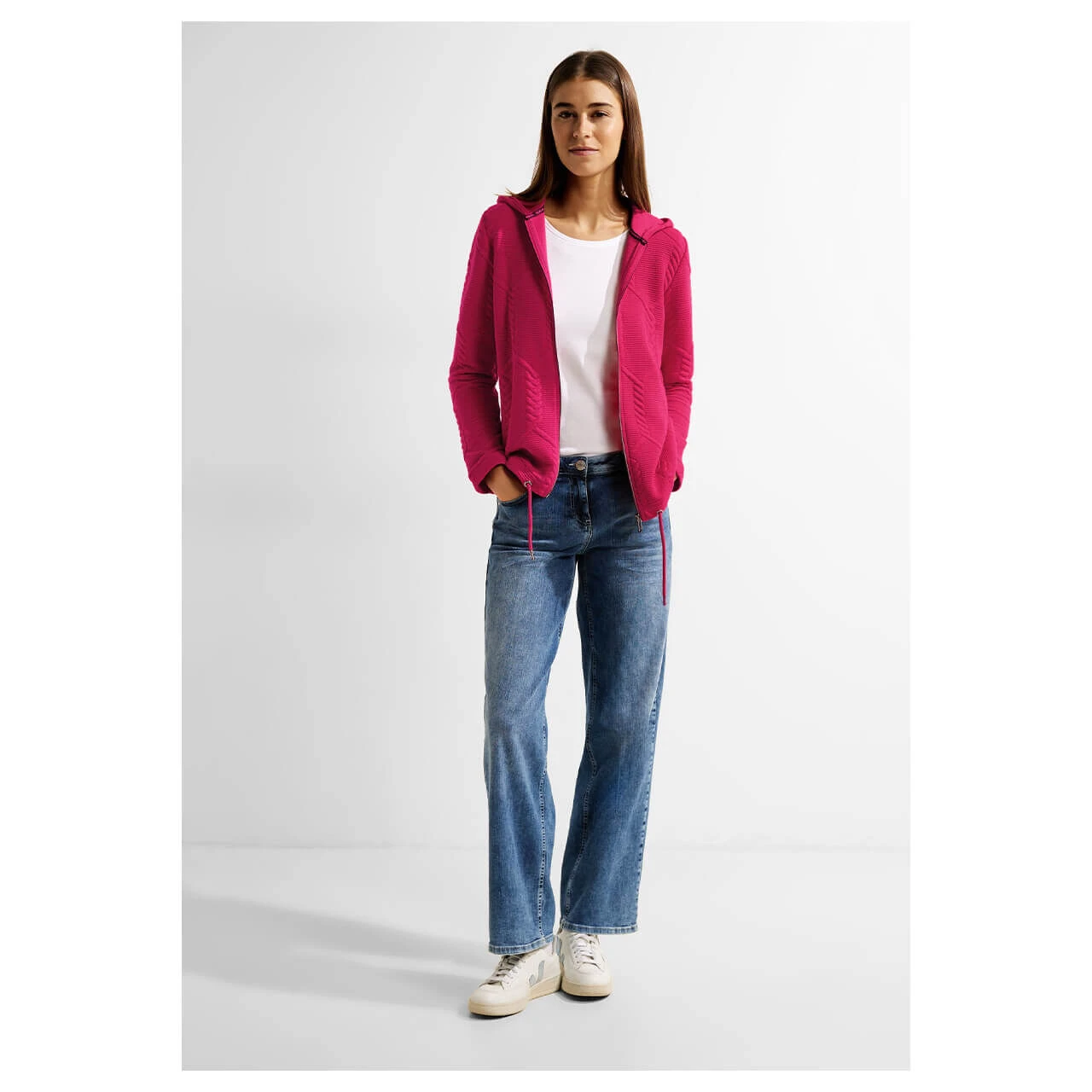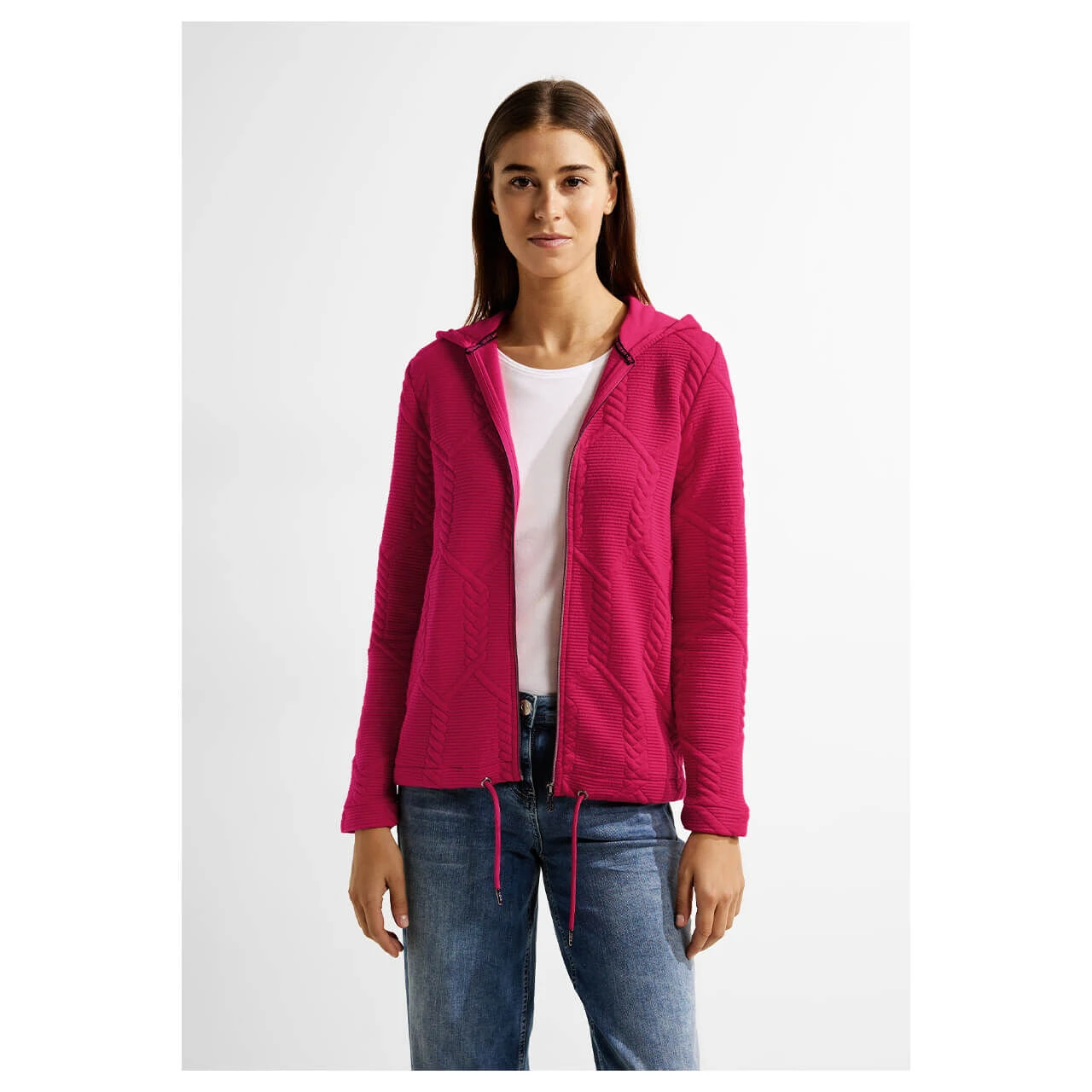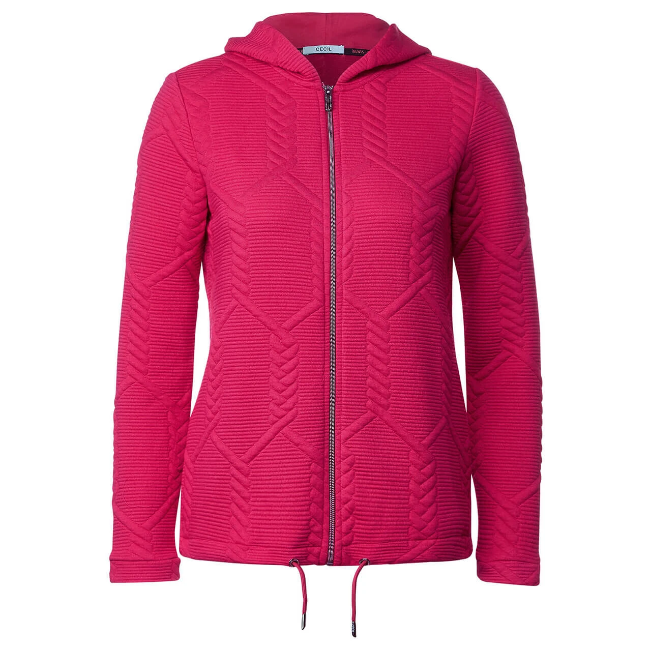 Stylischer Begleiter für den Übergang! Die Cecil Damenjacke mit Kapuze, Reißverschluss, Tunnelzug im Bund und Strukturmuster ist eine leichte Übergangsjacke, die sich einfach kombinieren lässt. Ein praktisches und zugleich modisches Kleidungsstück im Hoodie Style und kombifreundlicher Unifarbe.