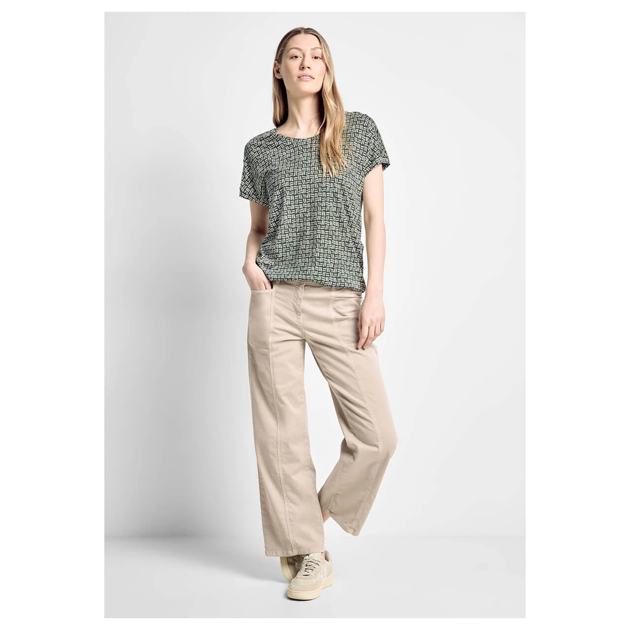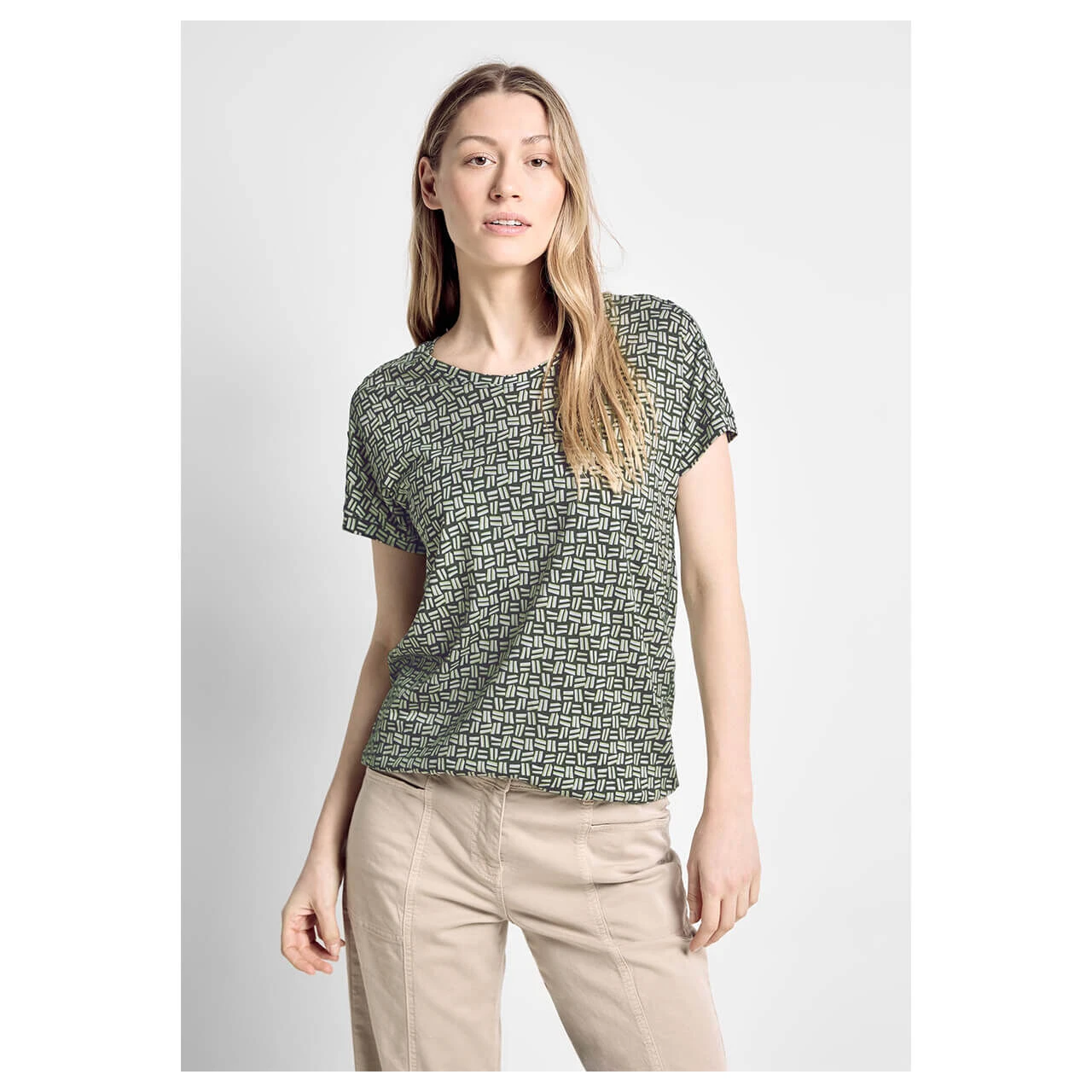 Das Damen T-Shirt von Cecil präsentiert sich mit einem trendigen Minimalprint und einem charmanten Knopfdetail an der Schulter. Dank des Gummibunds und der angenehmen Jersey-Qualität bietet es einen optimalen Tragekomfort für jeden Tag.