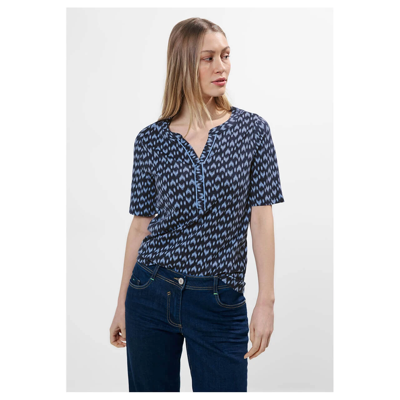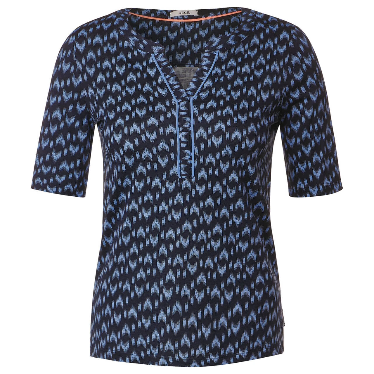 Das Damen T-Shirt von Cecil im Tunika-Style ist ein trendiges Kurzarmshirt für modebewusste Frauen. Der geschlitzte Rundhalsausschnitt und das grafische Minimalmuster verleihen diesem Oberteil eine moderne Note. Aus bequemem Baumwoll-Modal-Mix gefertigt, bietet es zudem äußerst angenehmen Tragekomfort.