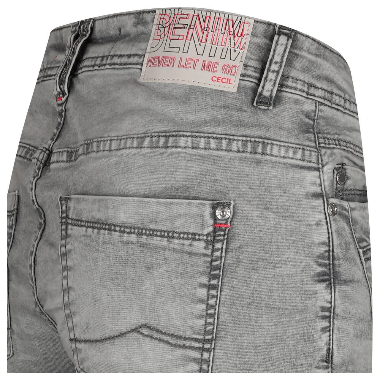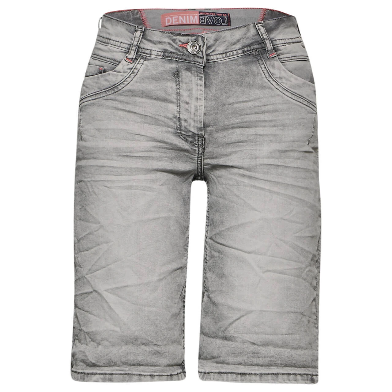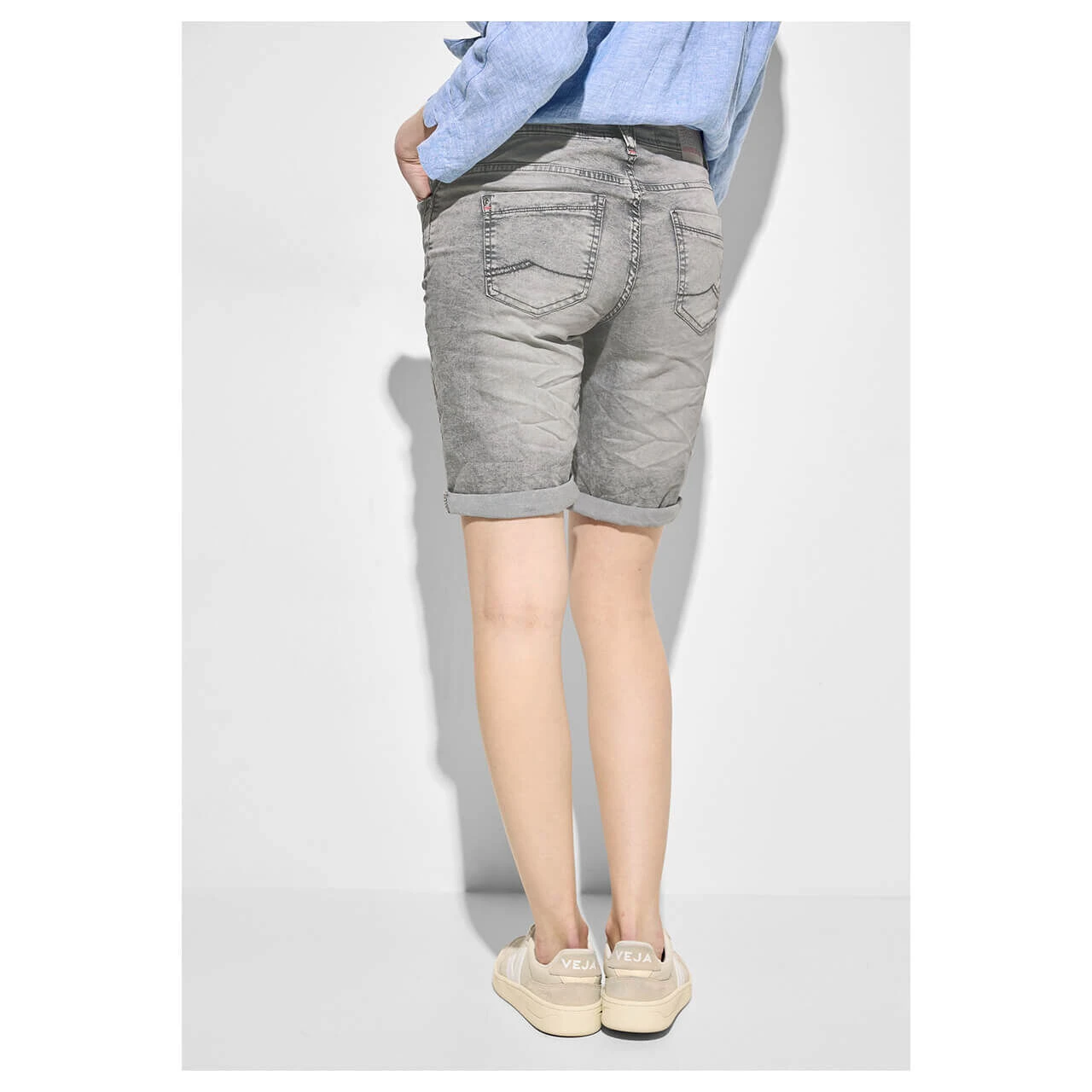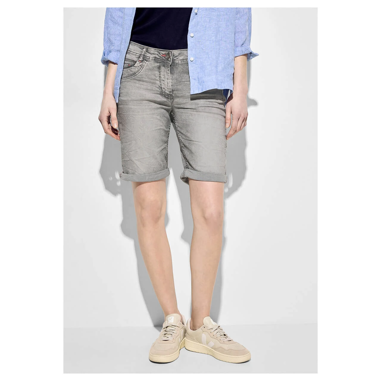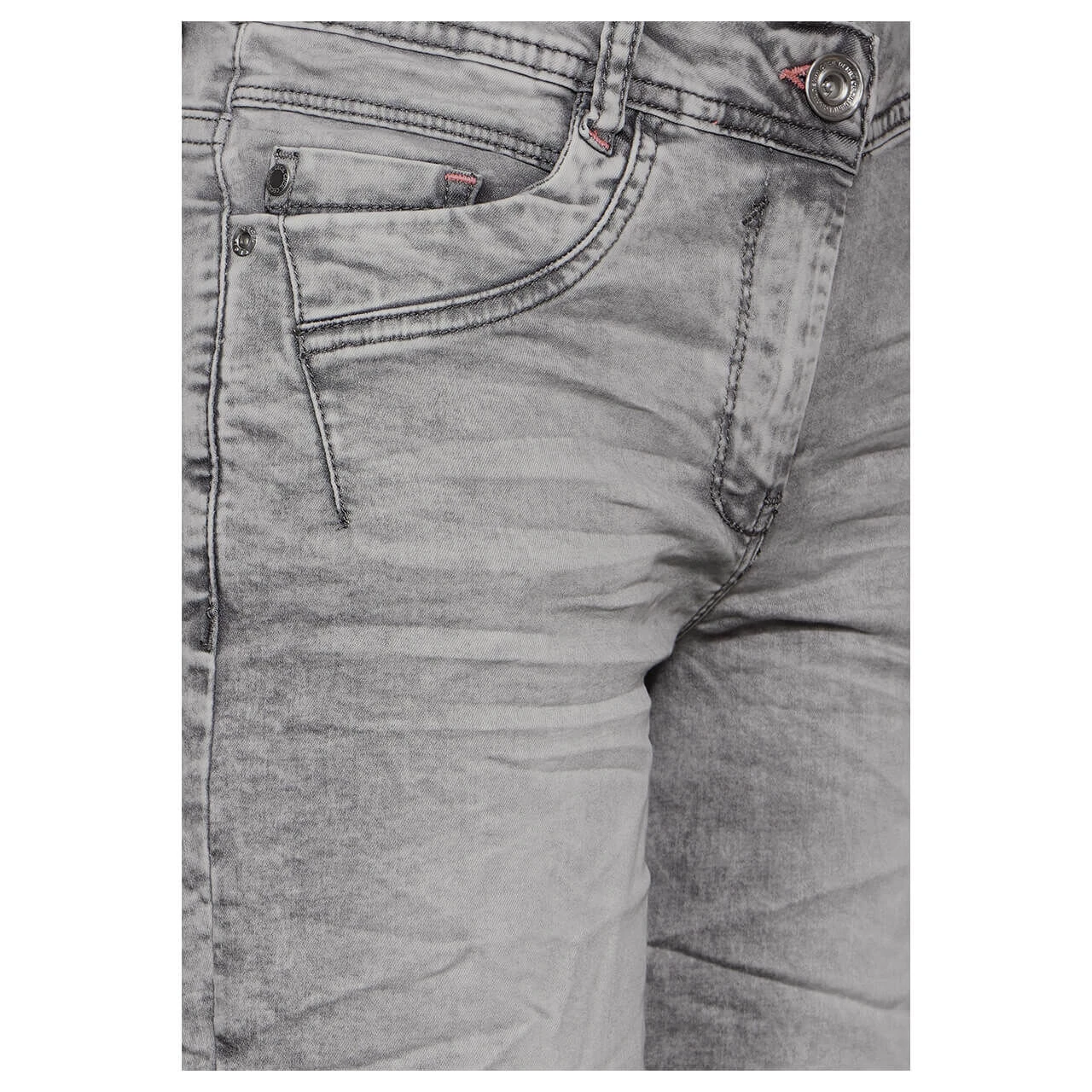Grau gleich langweilig? Die Cecil Scarlett beweist Ihnen das Gegenteil. Mit ihrer aufwändigen Waschung weist sie nämlich die unterschiedlichsten Grauabstufen auf. Die Kombination aus hellgrauem Grundton mit mittelgrauen Nuancen und dunkelgrauen Nähten schafft dabei einen körnig-wolkigen Eindruck. Fazit: eine kurze Damenjeans besonders kessen Charakters!