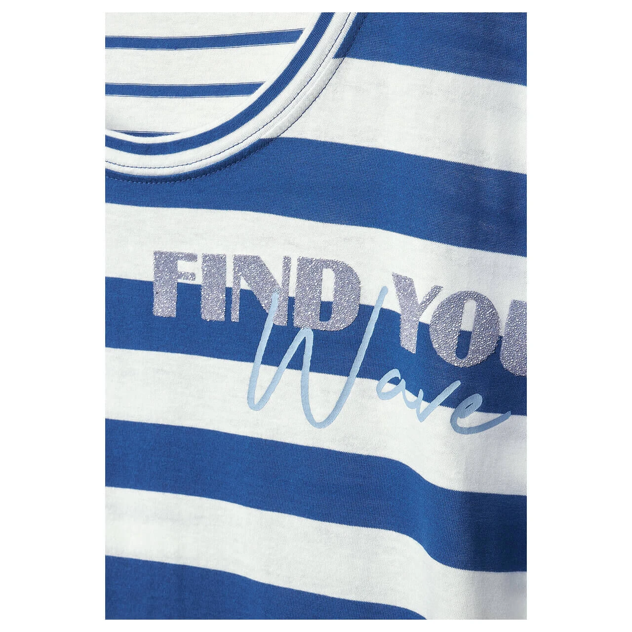 Find your wave! Das Cecil Damen T-Shirt überzeugt mit einem coolen Streifenmuster, das durch Wordings zusätzliche Eyecatcher bekommt. Mit Rundhalsausschnitt und im leichten Material ist es ein Allrounder für sommerliche Tage und passt gleichermaßen gut zu Röcken, Shorts und Jeans. An den überschnittenen Schultern überraschen Knotendetails.