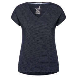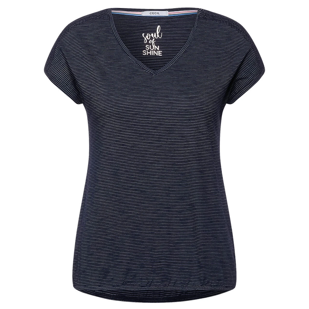 Spring break! Lockeres T-Shirt von Cecil mit femininen V-Ausschnitt. Die überschnittenen Schultern werden mit Smok Details noch zusätzlich in Szene gesetzt. Das Streifemuster und der Gummizug im Saum sorgen für eine sportliche Note. Kombinieren Sie eine Damenjeans zu dem schönen Dunkelblau!