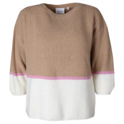 Der Comma Damenpullover kommt in einem femininem Dreiklang daher: Der helle Braunton wird mit einem zarten Streifen in Rosa vom sanften Cremeweiß getrennt. Das klassische, gerade Strickmuster vervollständigt das Design des Oberteils.