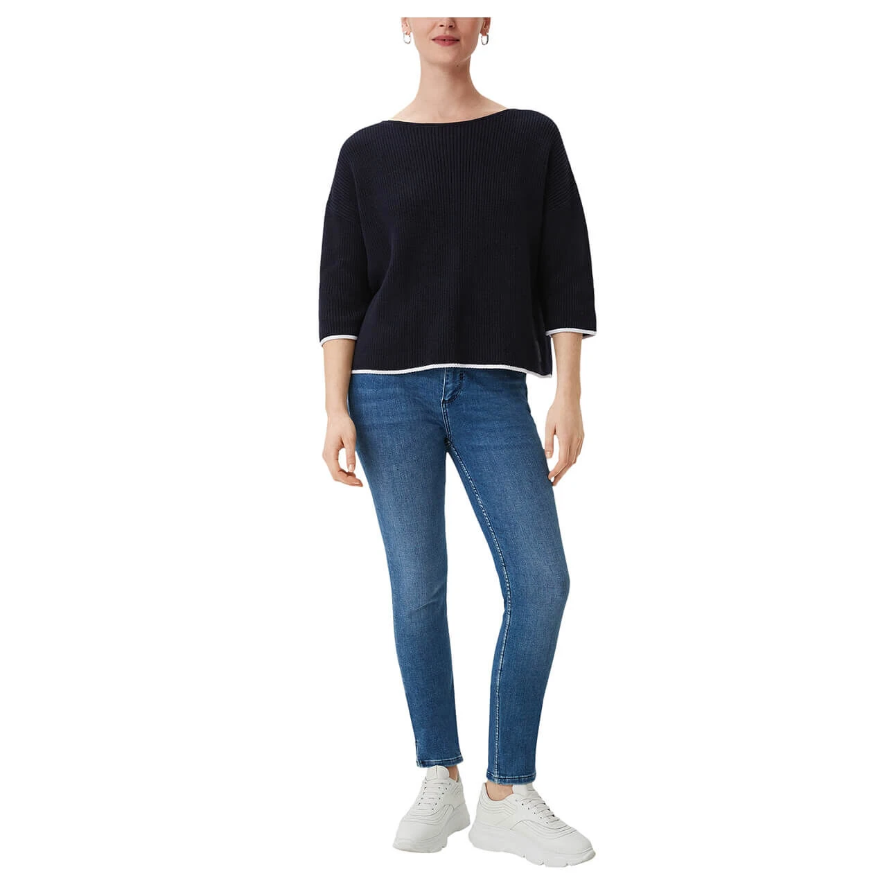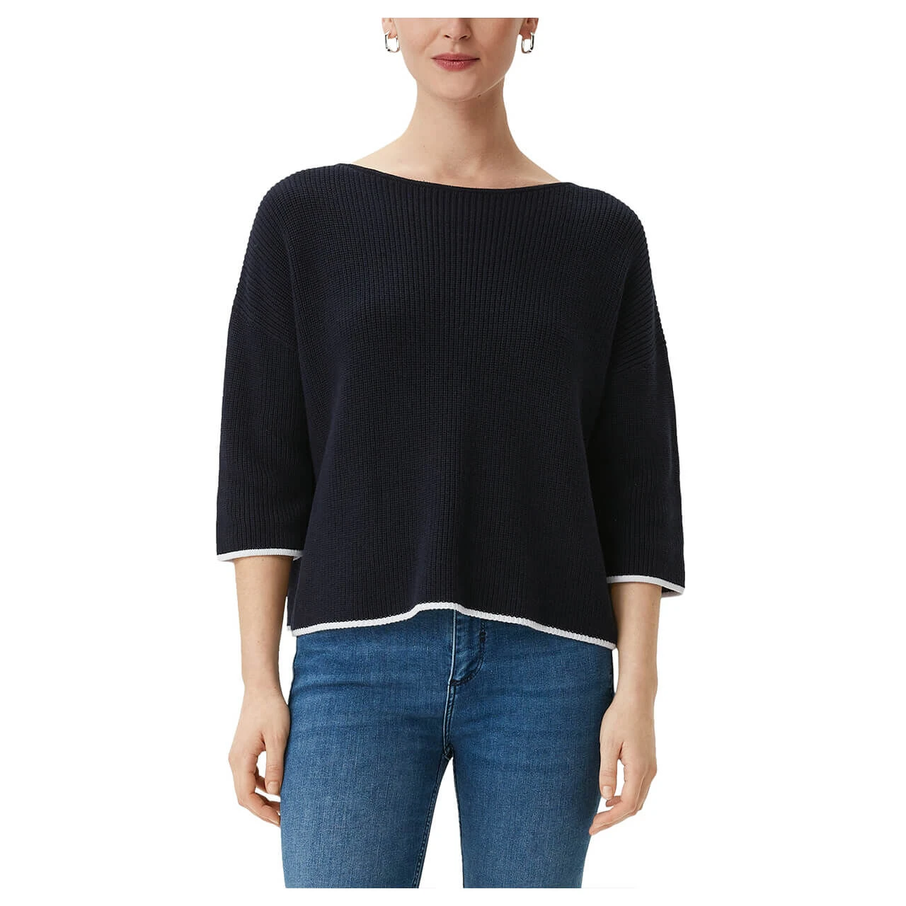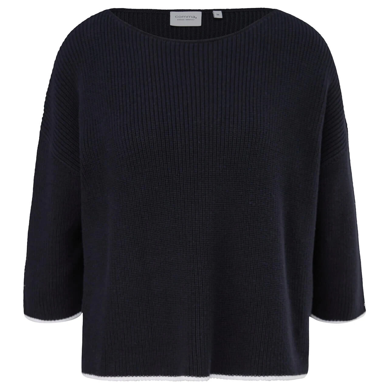Ein wahrer Zärtling ist dieser Damenpullover von Comma! Das klassische, gerade Strickmuster kommt in einem dunklen Blau daher und wirkt deshalb besonders schick und zeitlos. Ärmelenden und Bund schließen je mit einer dezenten, weißen Borde ab und kreieren damit einen Look, der elegant wie alltagstauglich ist. Für ein bequemes Tragegefühl sorgt darüber hinaus das angenehme Baumwollmaterial.