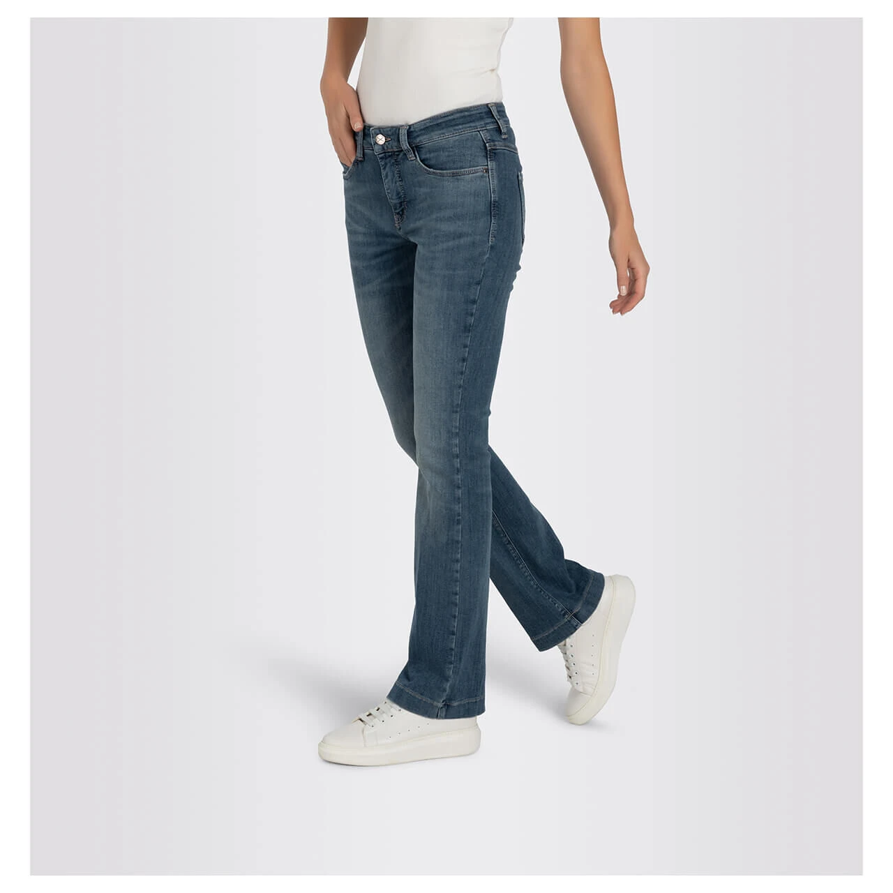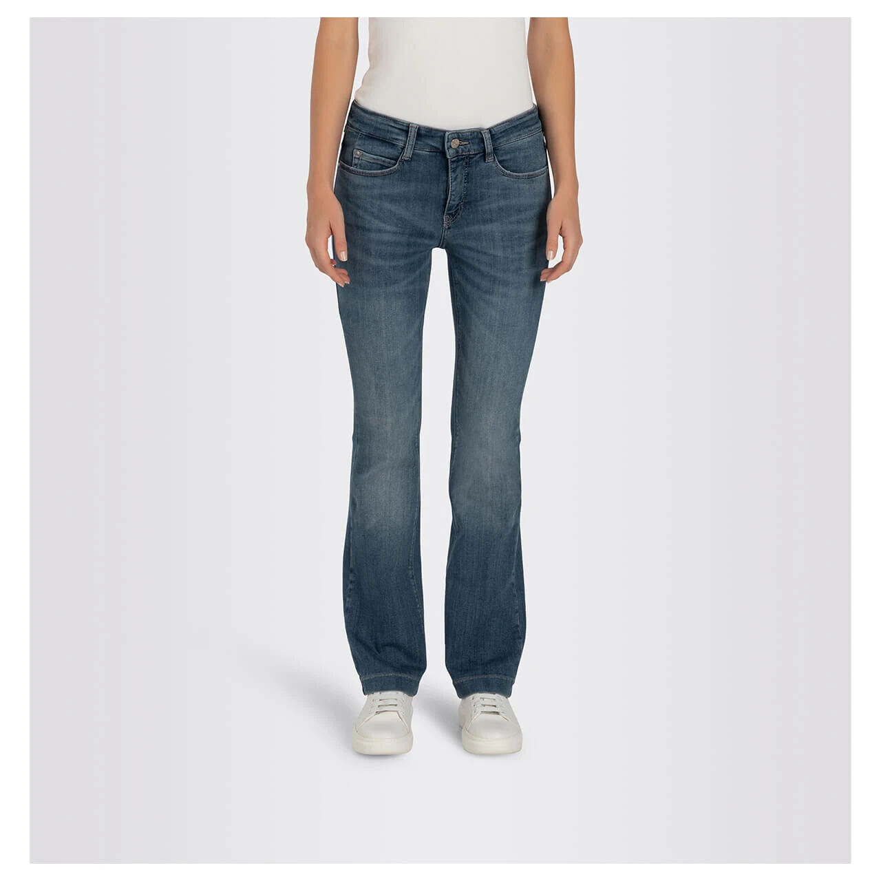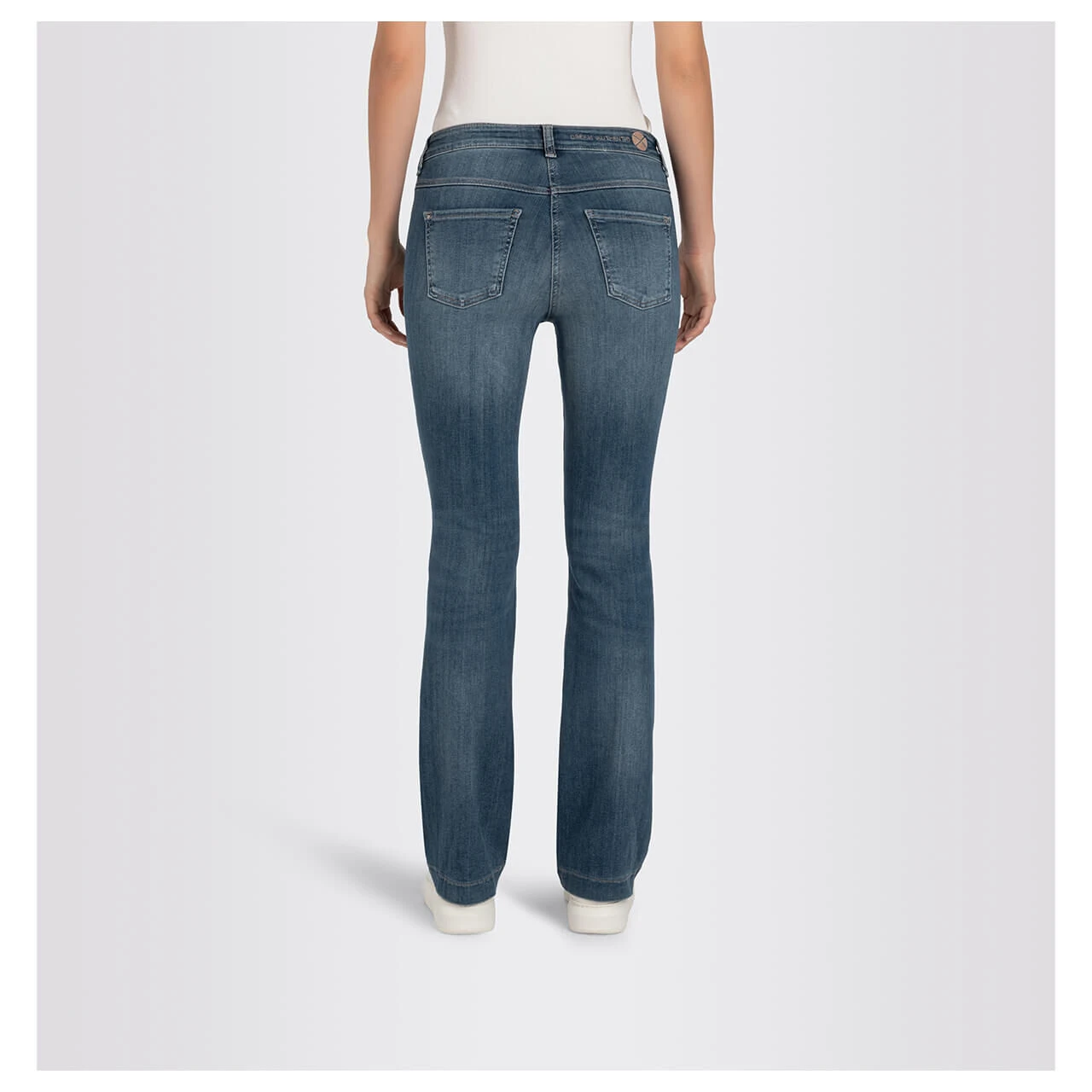Die MAC Dream Boot zeigt Modebewusstsein! Mit ihrem ausgestellten Bein ist die Passform derzeit sehr gefragt. Die zeitlose Denimfarbe trägt modische Verwaschungen.