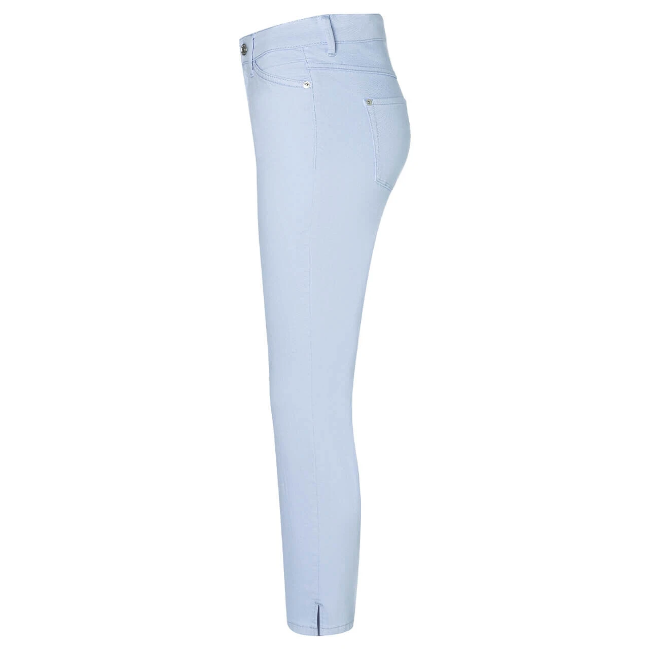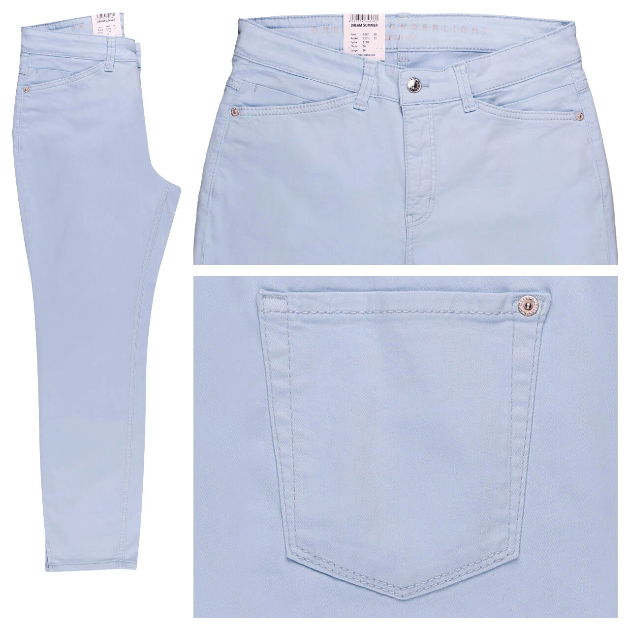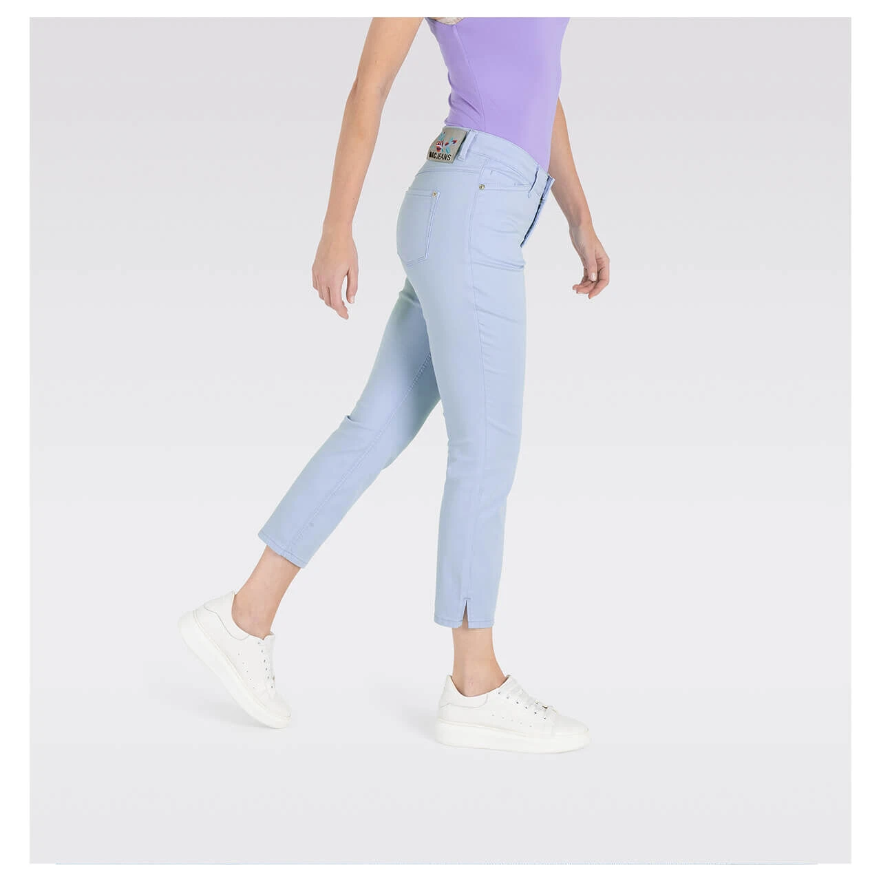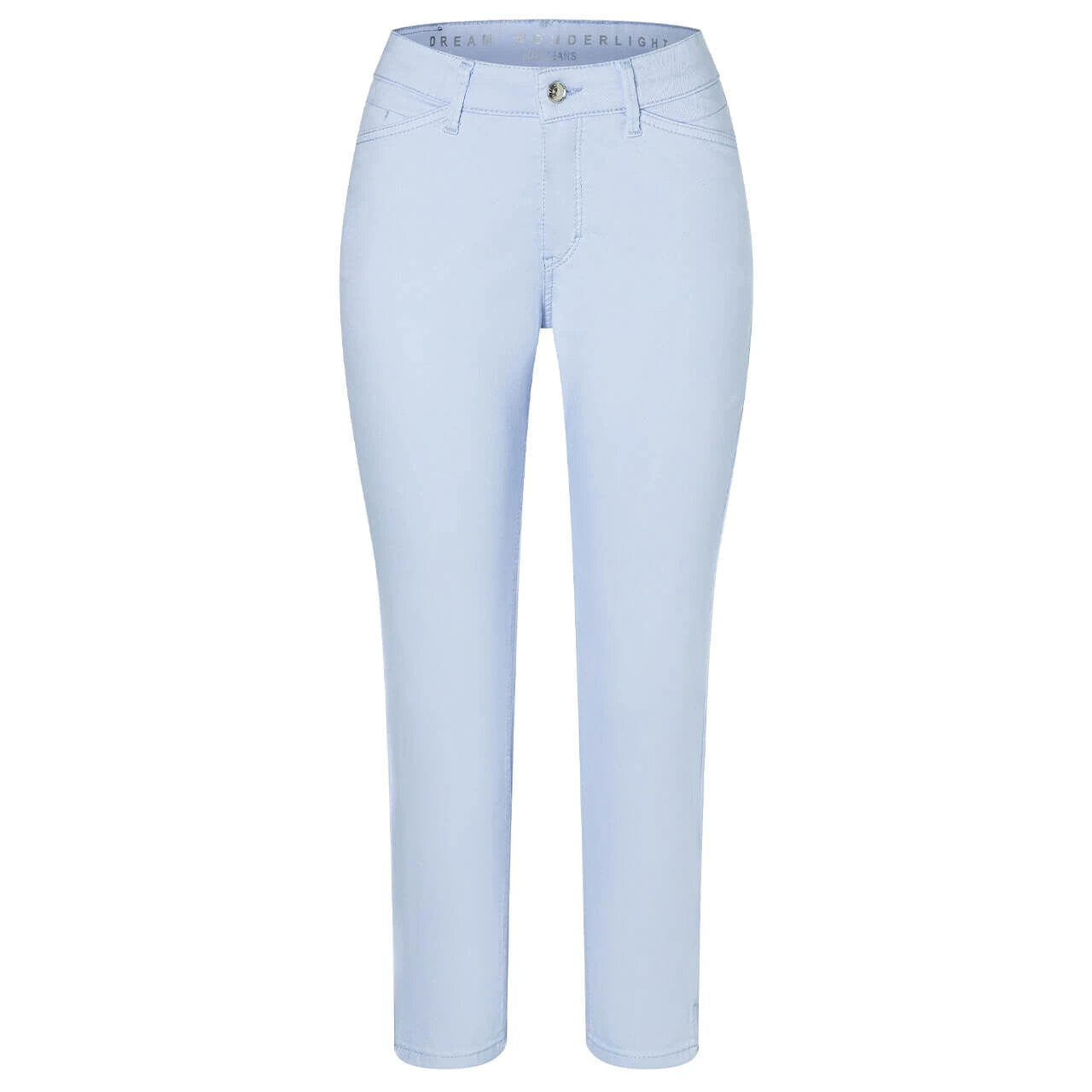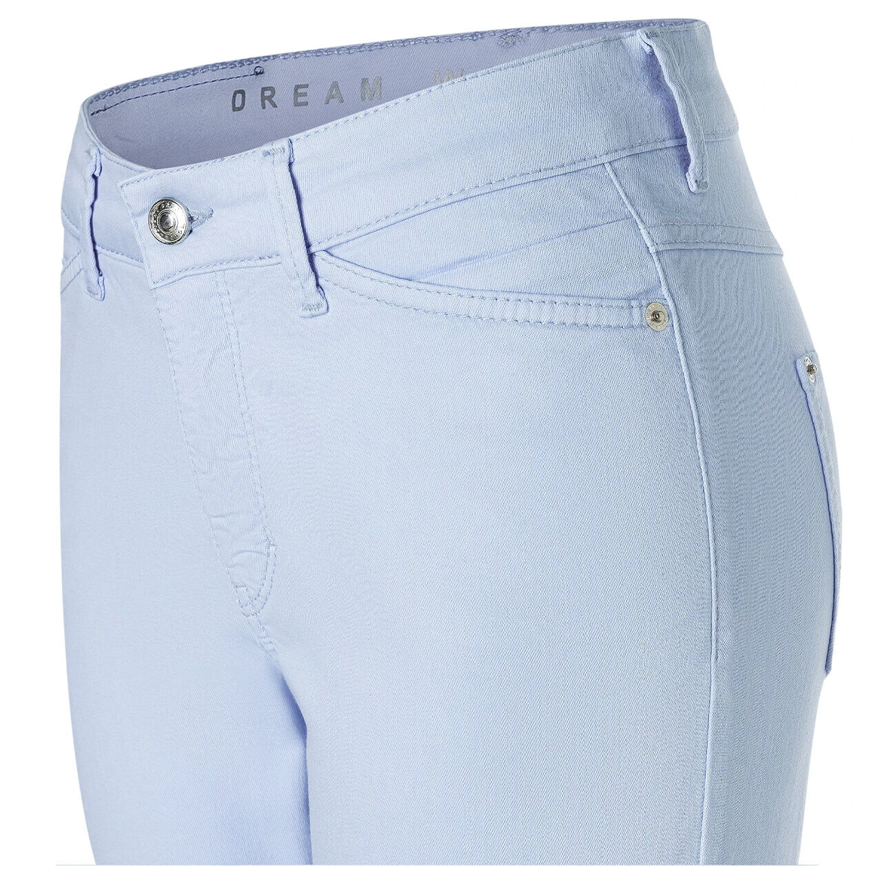 Ein Himmelblau zum Wegträumen! Die MAC Dream verzaubert Sie mit einem zarten Pastellton. Passend zum leichten Stoff der verkürzten Damenhose gestaltet sich der blumige, bunte Patch auf der Rückseite.