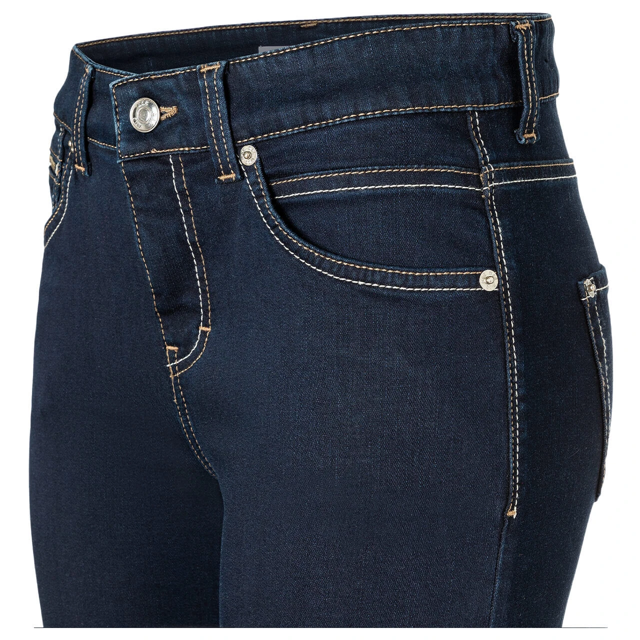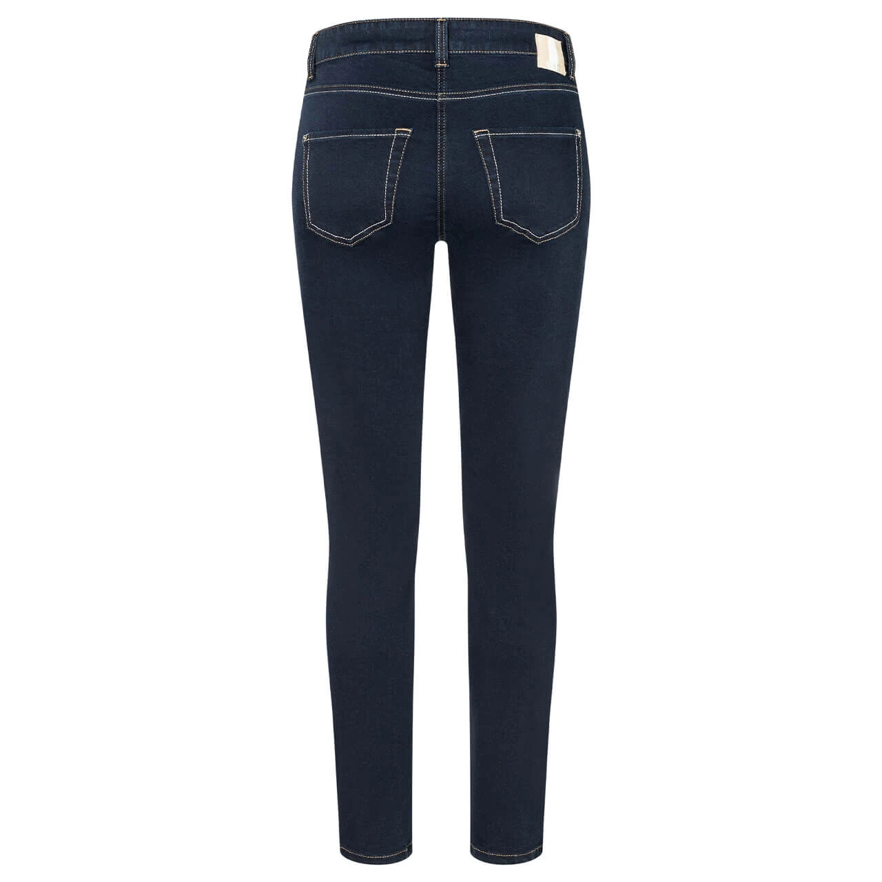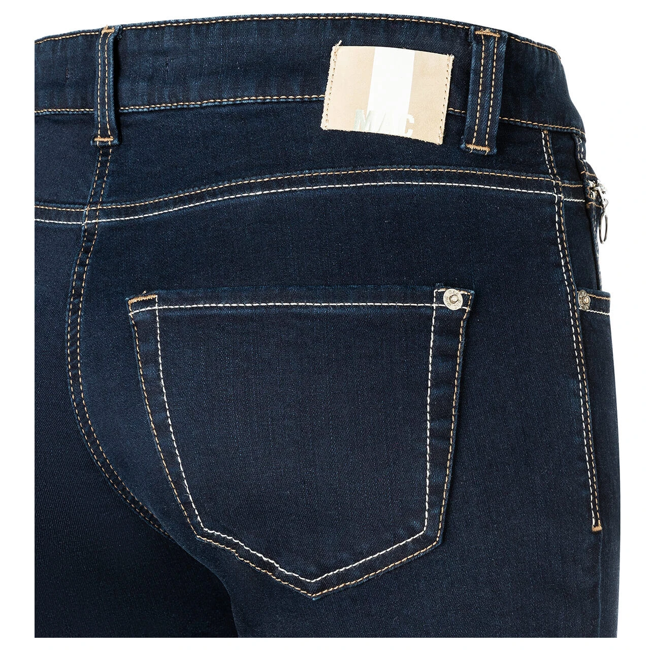 Zweifarbigkeit ist das Motto der MAC Slim! Die Damenjeans überrascht nicht nur mit einem braun-weißen Echtlederpatch, sondern auch mit Nähten in dieser Farbe. Sie setzen einen kräftigen Kontrast zum einheitlichen Dunkelblau der Slim.