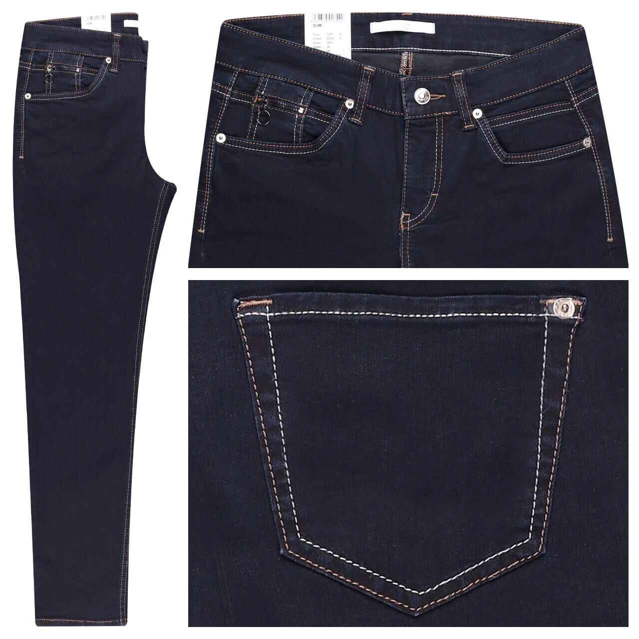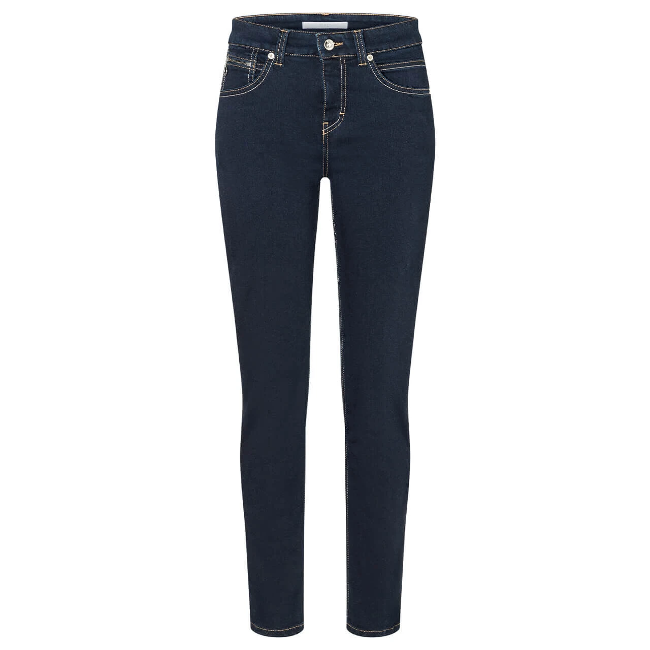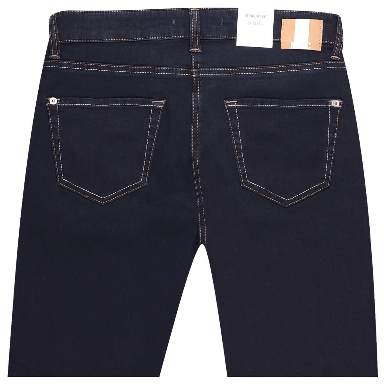 Zweifarbigkeit ist das Motto der MAC Slim! Die Damenjeans überrascht nicht nur mit einem braun-weißen Echtlederpatch, sondern auch mit Nähten in dieser Farbe. Sie setzen einen kräftigen Kontrast zum einheitlichen Dunkelblau der Slim.