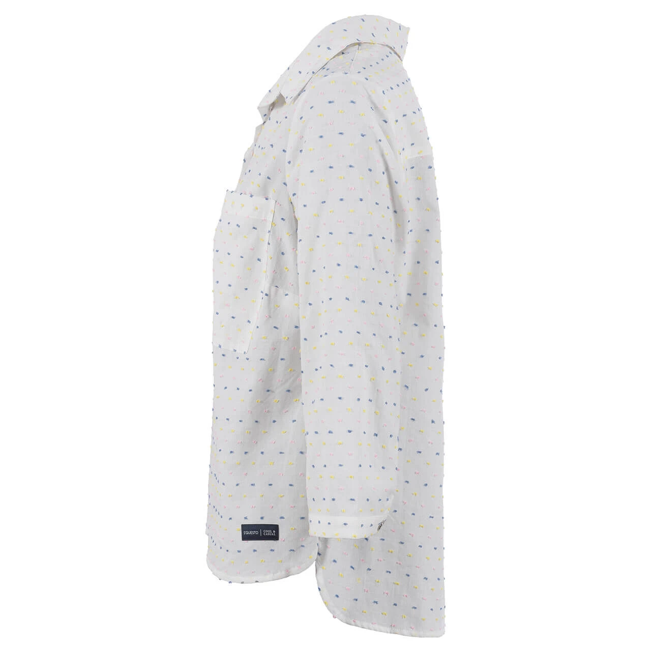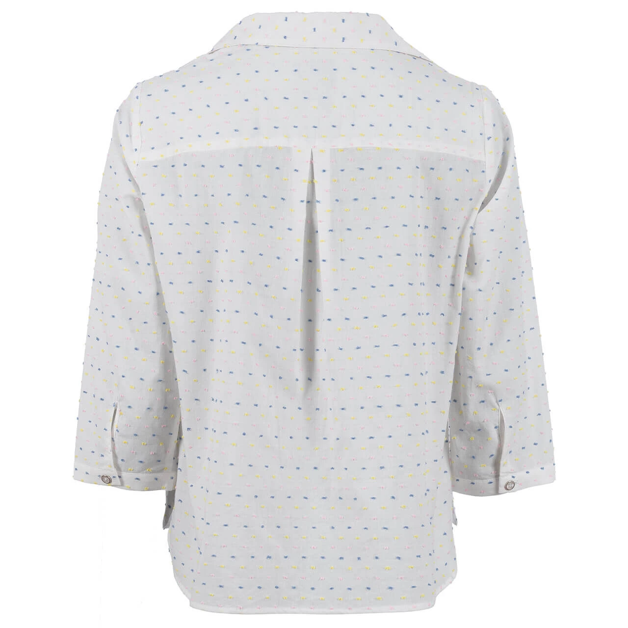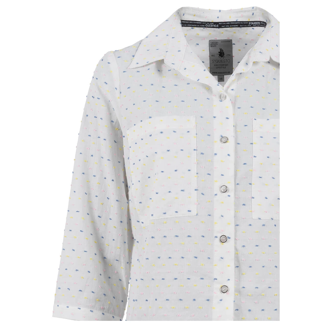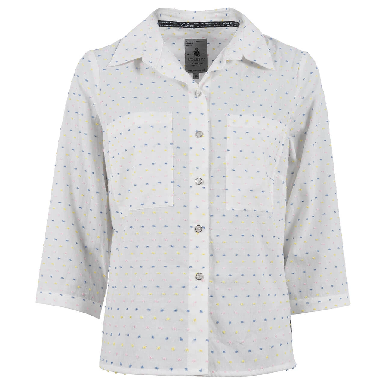 Zart – zarter – diese Soquesto Damen Bluse! Sie besticht durch ein Allover-Muster mit gestickten Punkten in Rosa, Blau und Gelb. Die durchgängige Knopfleiste besteht aus silbernen Knöpfen und veredelt damit den elegant-süßen Look.