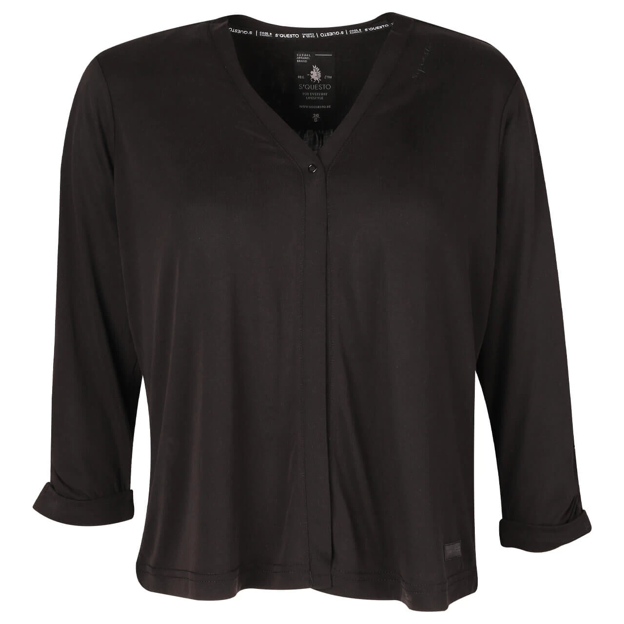 Die Soquesto Damen Shirtjacke besitzt einen Knopf am Kragen und zeigt sich sonst verschlusslos. Da der glatte, weiche Modalmix leicht ausfällt, eignet sich das Oberteil optimal für schicke Anlässe.