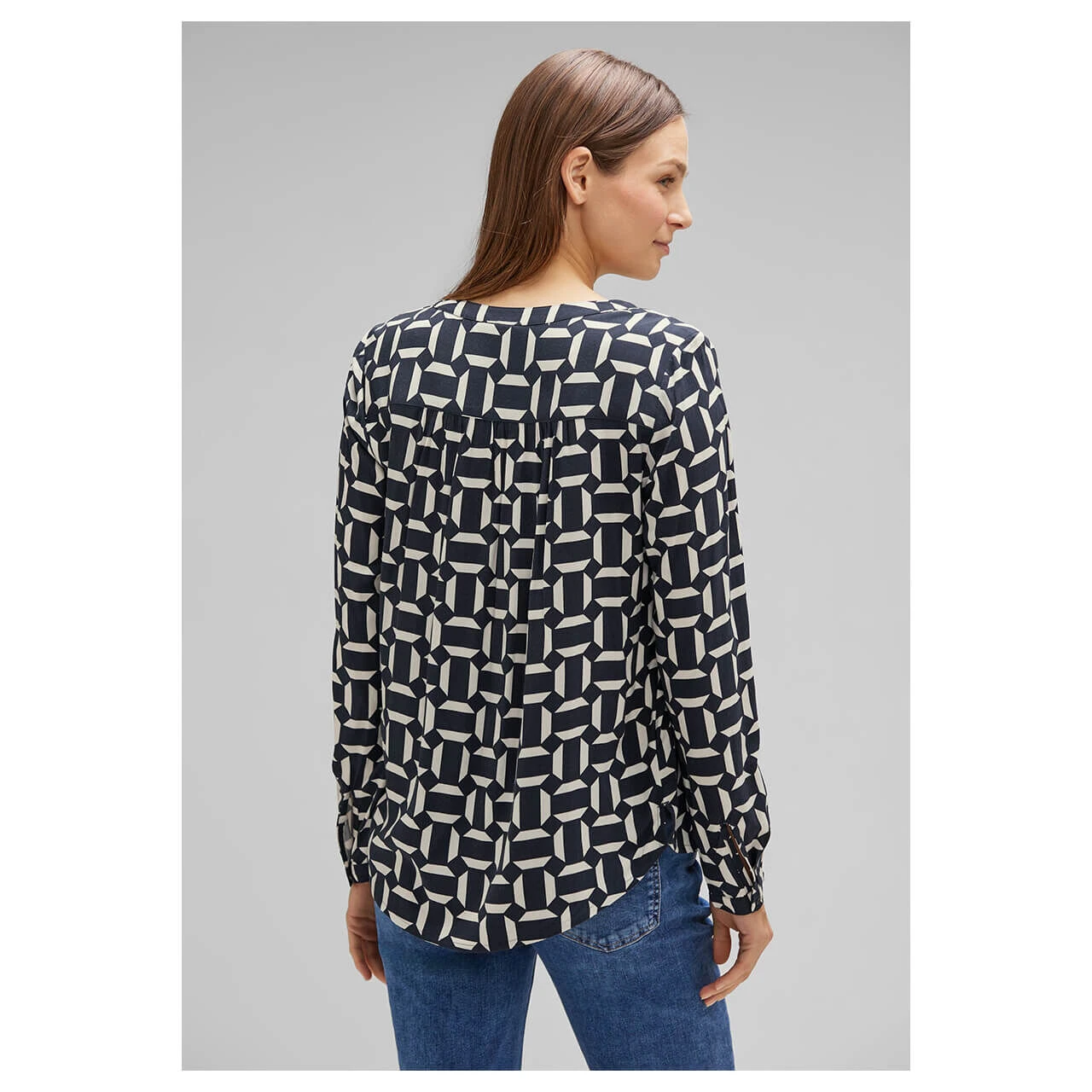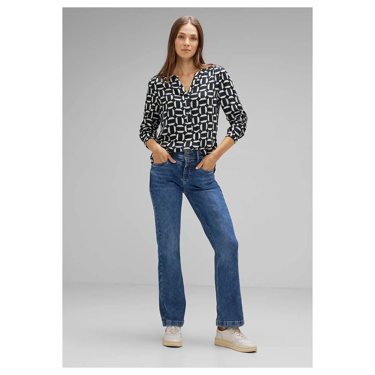 Zeitlose Eleganz! Die Damen Bluse im Style Bamika von Street One mit geschlitztem Rundhalsausschnitt und halber Knopfleiste verleiht Ihrem Look eine besondere Note und sorgt für einen stilvollen Auftritt. Der zweifarbige, grafische Print ist ein toller Eyecatcher und macht die Damenbluse zum neues Lieblingskleiderstück für jede Saison.