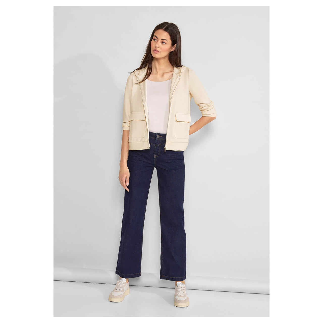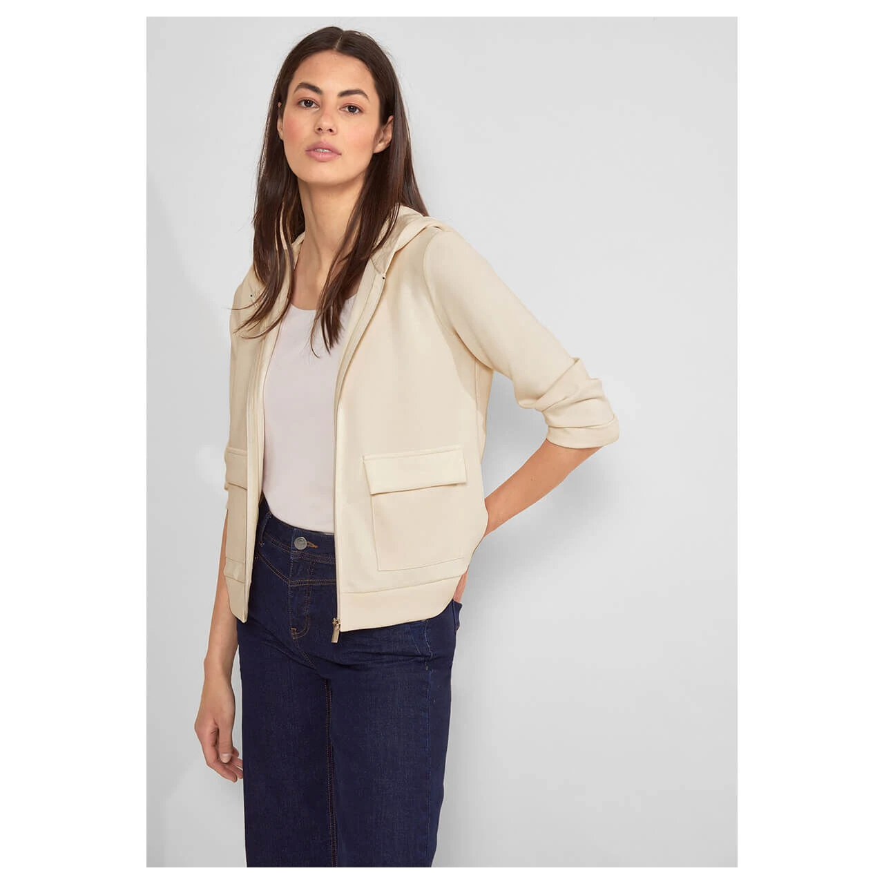 Die Street One Damen Shirtjacke überzeugt durch ihre Kapuze mit einem modernen Look. Der Reißverschluss und die Klappentaschen sorgen für praktische Details, während der Materialmix mit Stretchanteil angenehmen Tragekomfort bietet. Der 3/4 Arm macht diesen Seidenlook-Cardigan zu einem sportiven Begleiter für jede Jahreszeit!