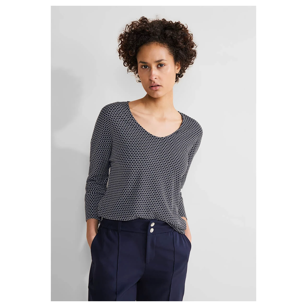 Basic mit gewissem Etwas! Das Damen Shirt von Street One mit 3/4-Arm und V-Ausschnitt ist ein vielseitiges Oberteil, das Sie zu vielen Anlässen tragen und flexibel kombinieren können. Das zweifarbige Wabenmuster verleiht diesem zeitlosen Basicteil eine trendige Note, der ausgewogene Materialmix mit Stretchanteil sorgt für einen hohen Tragekomfort.