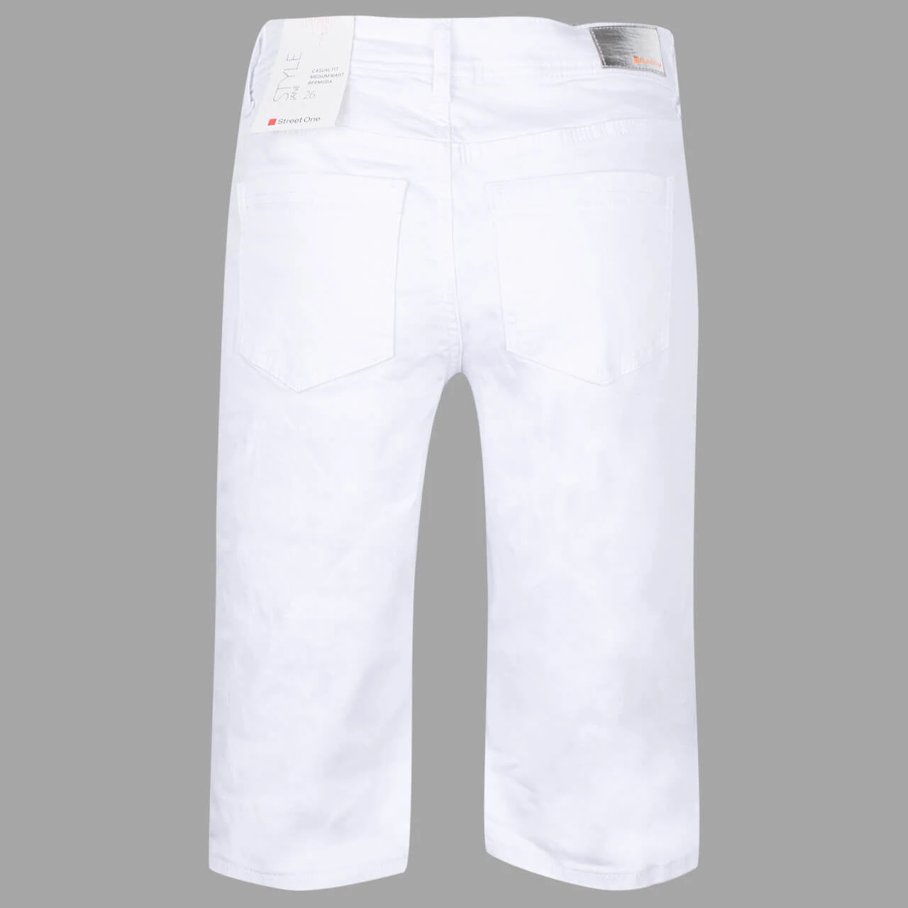 Mit der weißen Street One Jeans Jane haben Sie einen simplen Kombipartner für den Sommer gefunden! Die schneeweißen Bermudashorts haben als kleines Highlight eine Niete mit Herz an der linken Fronttasche.