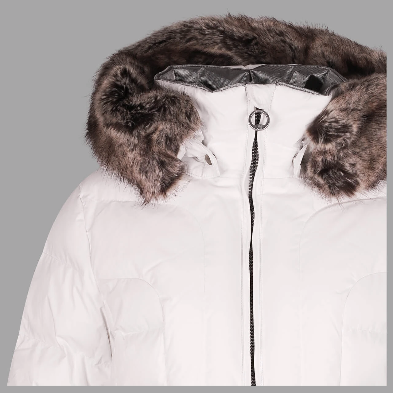 Die Wellensteyn Astoria Medium ist sowohl praktisch als auch modisch der perfekte Begleiter für die kalte Jahreszeit. Die wärmende Wattierung trotzt in Kombination mit der wasserabweisenden, winddichten und atmungsaktiven Funktion jeder Art von Wetter. Die Kapuze können Sie mit einem Tunnelzug nicht nur nach Belieben regulieren, sondern Sie können die Kopfbedeckung auch abnehmen – genauso wie den Kunstfellbesatz. Durch die Strickbündchen brauchen Sie sich keine Sorgen zu machen, dass Kälte oder Nässe in die Ärmel der Damen Winterjacke gelangen. Die seitlichen Reißverschlusstaschen bieten ausreichend Platz für kleine Alltagsbegleiter und sind dank weichem Teddyfutter echte Handwärmer. Zwei Innentaschen geben zusätzlichen Stauraum. Der strahlend weiße Farbton wirkt mit dem matten Obermaterial besonders elegant!